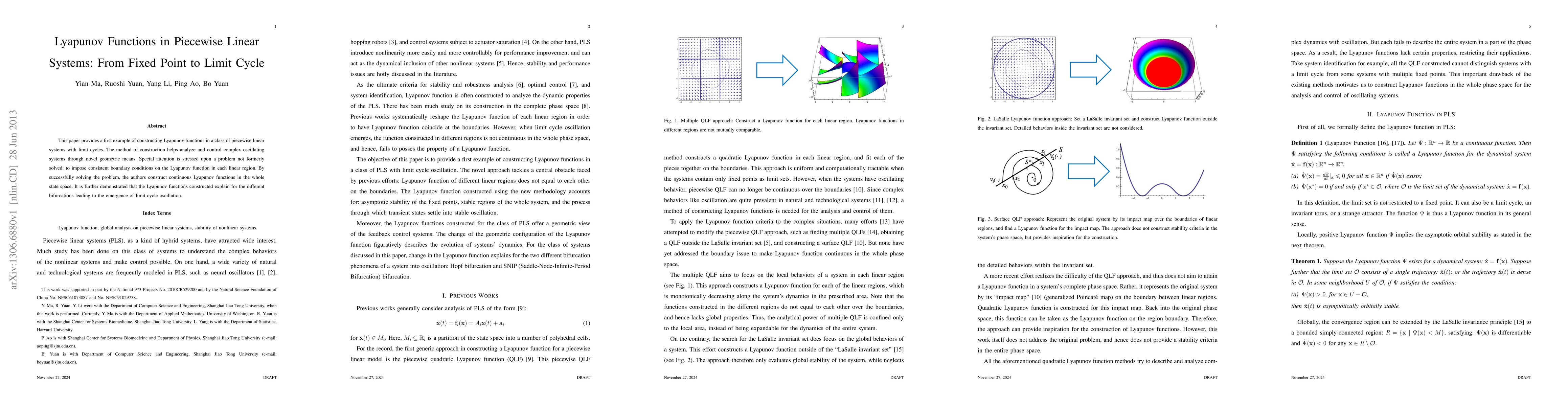 This paper constructs Lyapunov functions for piecewise linear systems with limit cycles, addressing the challenge of consistent boundary conditions across linear regions. The developed method elucidates bifurcations leading to limit cycle oscillations through novel geometric analysis.
