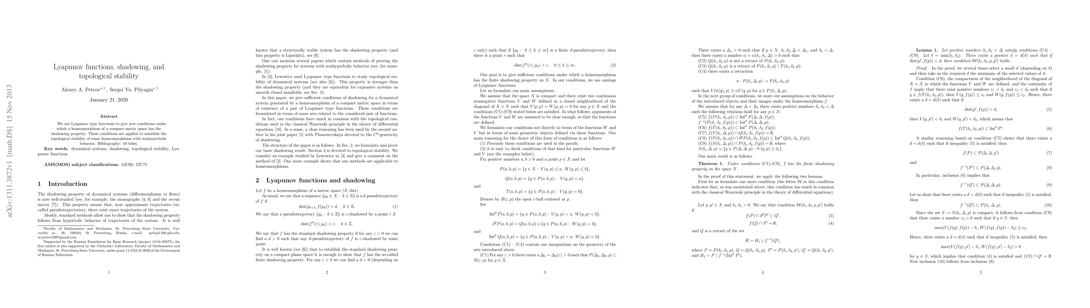 Summary: This paper introduces new conditions using Lyapunov functions to determine when a homeomorphism of a compact metric space exhibits the shadowing property, and applies these conditions to establish topological stability for homeomorphisms with nonhyperbolic behavior.