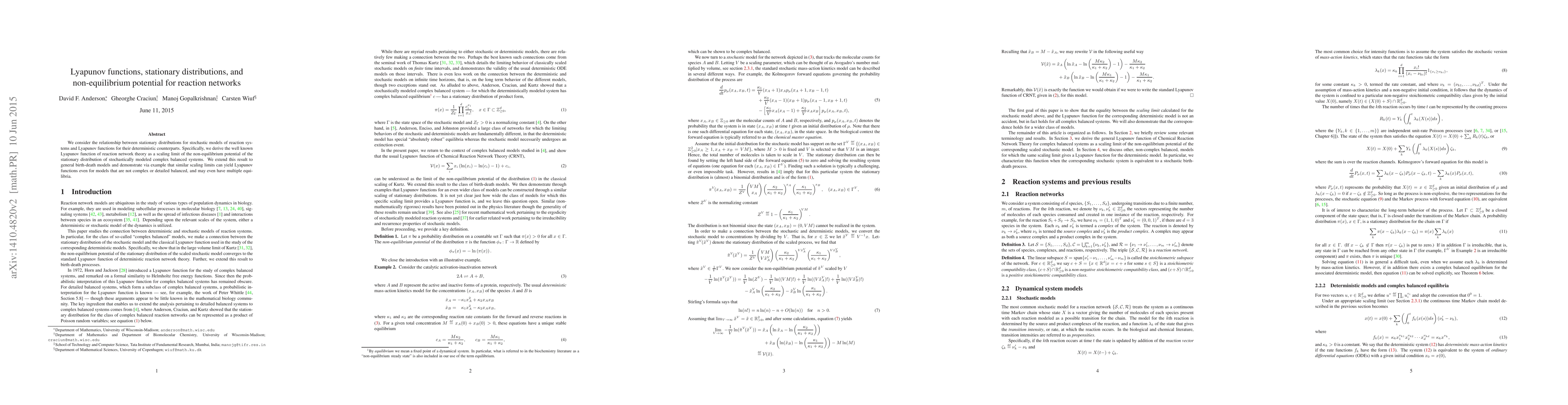 This paper explores the connection between stationary distributions in stochastic reaction systems and Lyapunov functions in their deterministic counterparts, deriving the Lyapunov function as a scaling limit of the non-equilibrium potential. It extends these findings to general birth-death models, showing that similar limits can yield Lyapunov functions even for systems without complex or detailed balance and with multiple equilibria.