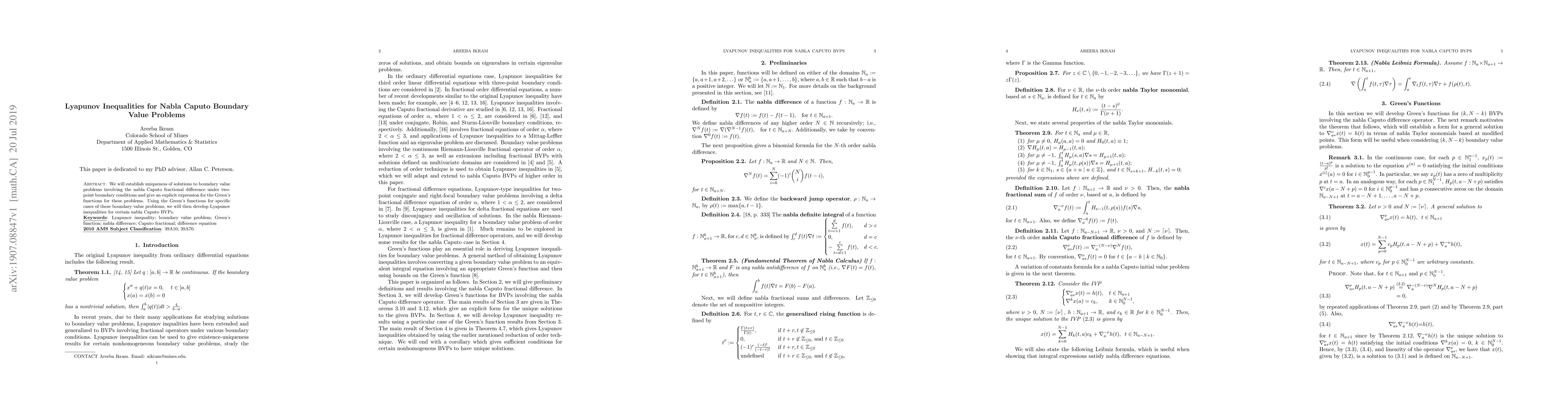 This paper establishes uniqueness of solutions for boundary value problems involving nabla Caputo fractional differences under two-point boundary conditions and provides explicit Green's functions. It then derives Lyapunov inequalities for specific nabla Caputo boundary value problems using these Green's functions.