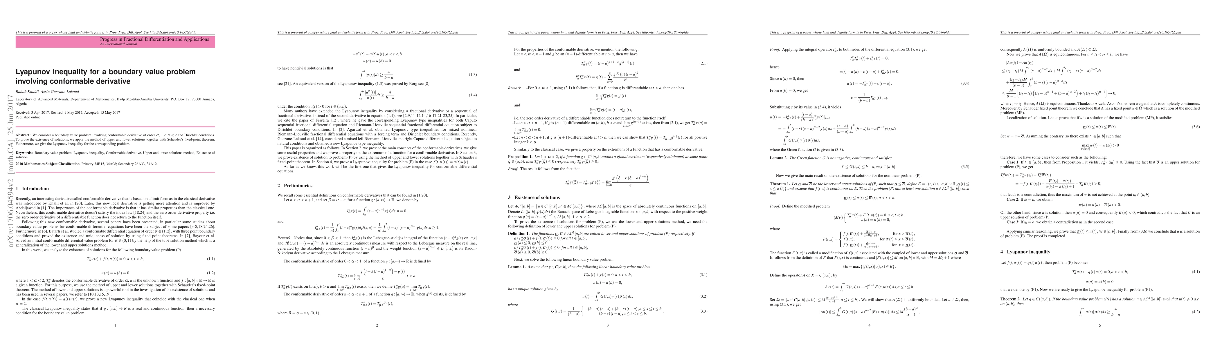 This paper applies a fixed-point theorem to solve a boundary value problem with a conformable derivative, proving its existence and giving the Lyapunov inequality for solutions.