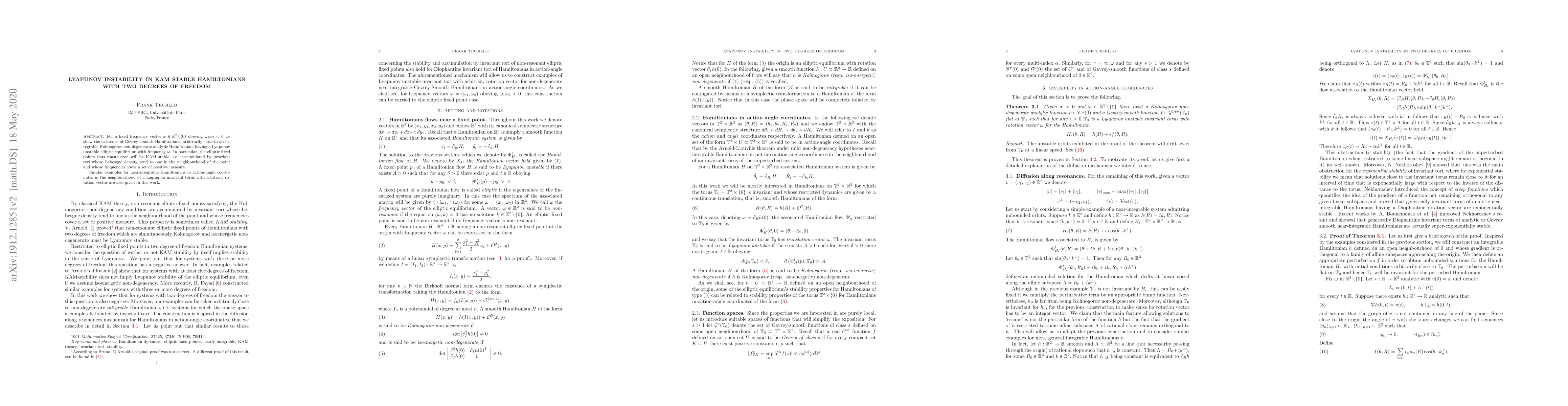 This paper demonstrates the existence of Lyapunov unstable elliptic equilibria in Gevrey-smooth Hamiltonians near integrable Kolmogorov-stable systems, despite these equilibria being KAM stable. It also extends these findings to near-integrable Hamiltonians near Lagrangian invariant tori with arbitrary rotation vectors.