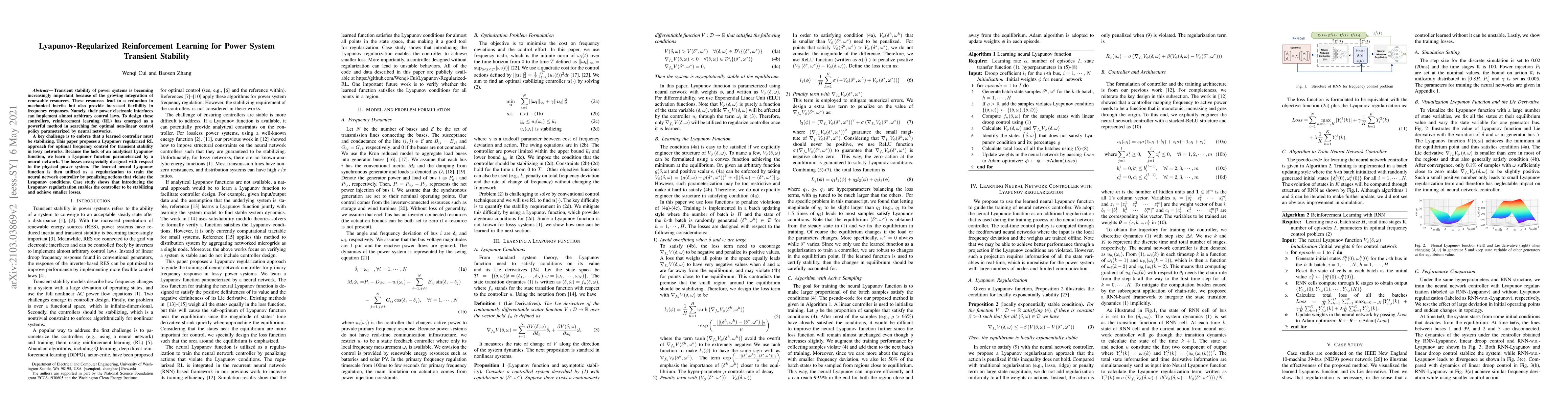 This paper proposes a Lyapunov-regularized reinforcement learning method to enhance transient stability in power systems with renewable resources. It learns a neural network-based Lyapunov function to stabilize controllers, demonstrating improved performance and stability in simulations.