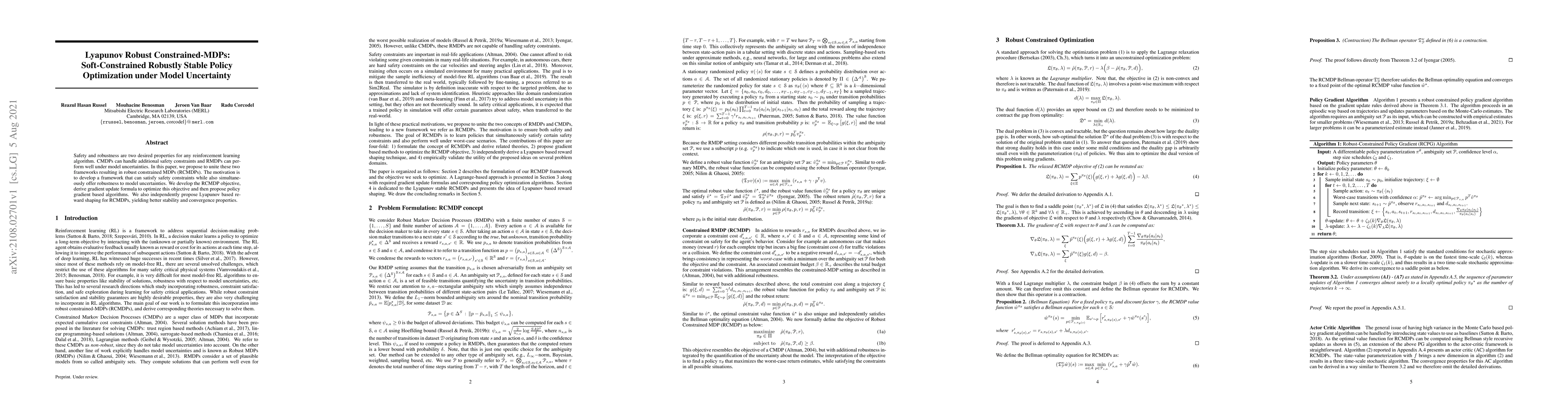 This paper introduces robust constrained Markov Decision Processes (RCMDPs) to combine safety constraints with model uncertainty robustness. It proposes an RCMDP objective, a gradient update formula, and policy gradient algorithms, along with Lyapunov-based reward shaping to enhance stability and convergence.