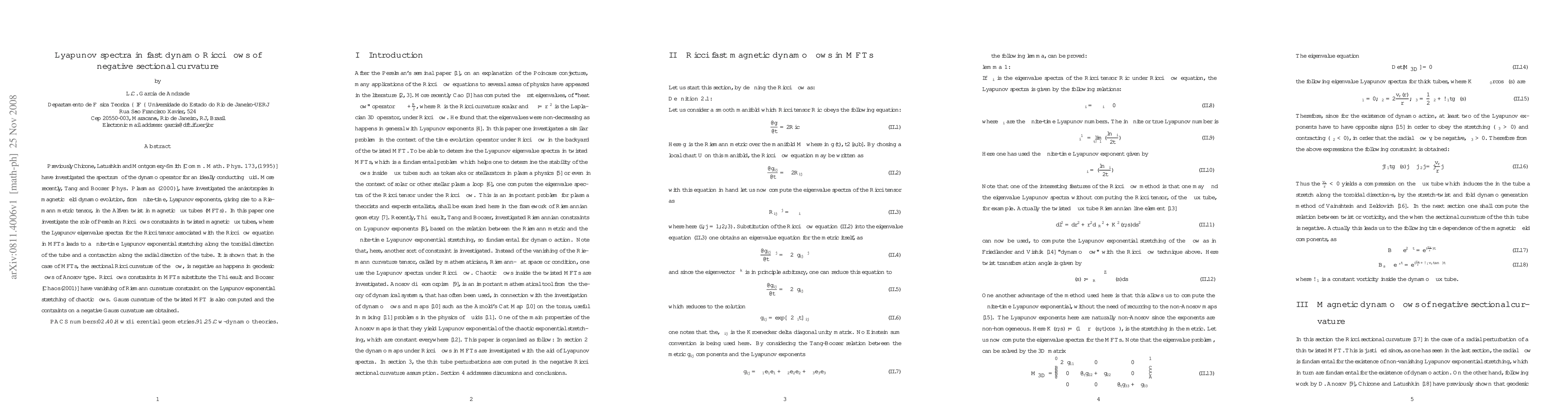 This paper investigates the Lyapunov spectra in fast dynamo Ricci flows with negative sectional curvature, focusing on the dynamics in twisted magnetic flux tubes (MFTs). It demonstrates that Ricci flows constraints lead to finite-time Lyapunov exponential stretching along the toroidal direction and contraction along the radial direction, with negative sectional Ricci curvature akin to geodesic flows of Anosov type.