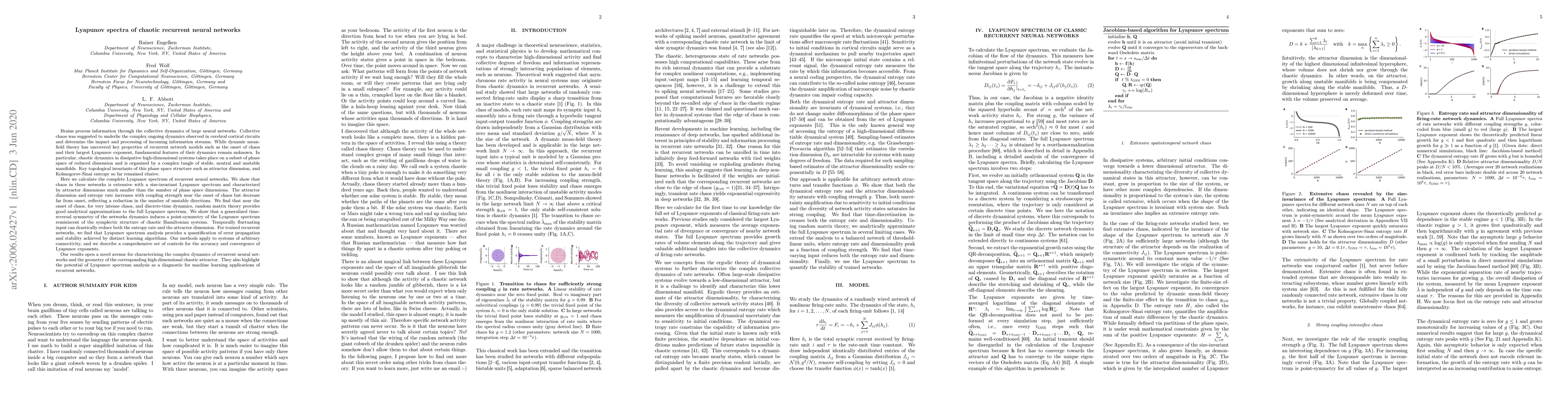 Brains process information through the collective dynamics of large neural networks. Collective chaos was suggested to underlie the complex ongoing dynamics observed in cerebral cortical circuits and determine the impact and processing of incoming information streams. In dissipative systems, chaotic dynamics takes place on a subset of phase space of reduced dimensionality and is organized by a complex tangle of stable, neutral and unstable manifolds. Key topological invariants of this phase space structure such as attractor dimension, and Kolmogorov-Sinai entropy so far remained elusive. Here we calculate the complete Lyapunov spectrum of recurrent neural networks. We show that chaos in these networks is extensive with a size-invariant Lyapunov spectrum and characterized by attractor dimensions much smaller than the number of phase space dimensions. We find that near the onset of chaos, for very intense chaos, and discrete-time dynamics, random matrix theory provides analytical approximations to the full Lyapunov spectrum. We show that a generalized time-reversal symmetry of the network dynamics induces a point-symmetry of the Lyapunov spectrum reminiscent of the symplectic structure of chaotic Hamiltonian systems. Fluctuating input reduces both the entropy rate and the attractor dimension. For trained recurrent networks, we find that Lyapunov spectrum analysis provides a quantification of error propagation and stability achieved. Our methods apply to systems of arbitrary connectivity, and we describe a comprehensive set of controls for the accuracy and convergence of Lyapunov exponents. Our results open a novel avenue for characterizing the complex dynamics of recurrent neural networks and the geometry of the corresponding chaotic attractors. They also highlight the potential of Lyapunov spectrum analysis as a diagnostic for machine learning applications of recurrent networks.