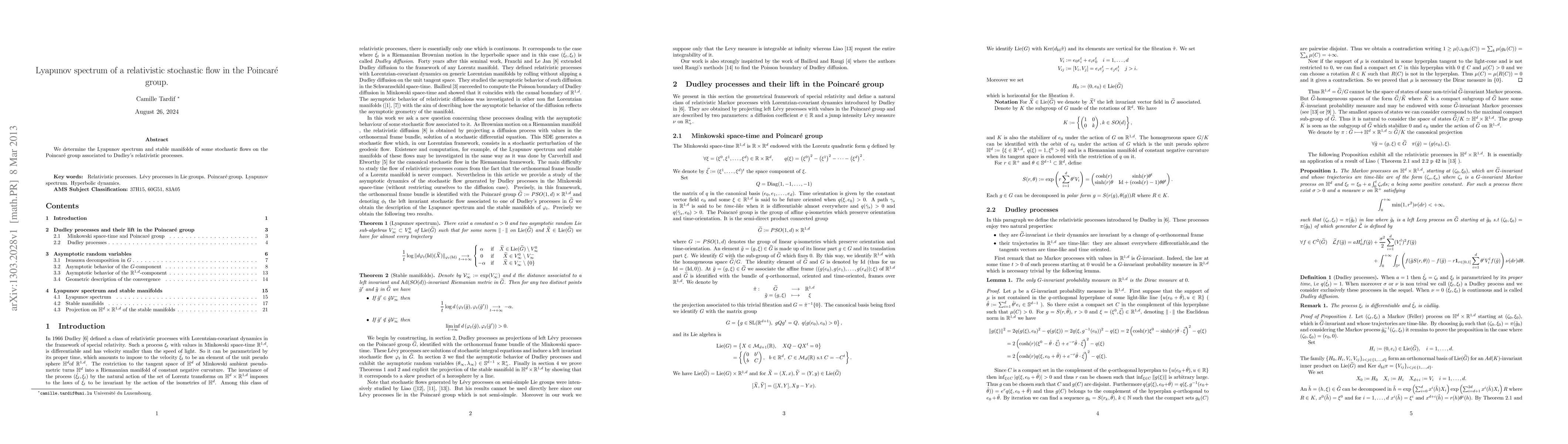 We determine the Lyapunov spectrum and stable manifolds of some stochastic flows on the Poincar\'e group associated to Dudley's relativistic processes.
