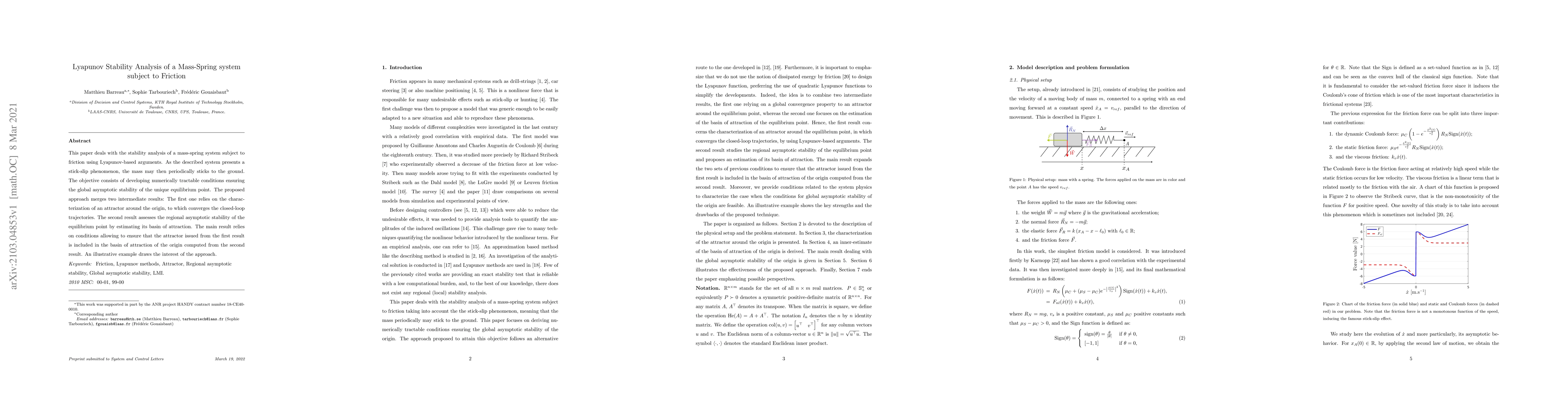 This paper deals with the stability analysis of a mass-spring system subject to friction using Lyapunov-based arguments. As the described system presents a stick-slip phenomenon, the mass may then periodically sticks to the ground. The objective consists of developing numerically tractable conditions ensuring the global asymptotic stability of the unique equilibrium point. The proposed approach merges two intermediate results: The first one relies on the characterization of an attractor around the origin, to which converges the closed-loop trajectories. The second result assesses the regional asymptotic stability of the equilibrium point by estimating its basin of attraction. The main result relies on conditions allowing to ensure that the attractor issued from the first result is included in the basin of attraction of the origin computed from the second result. An illustrative example draws the interest of the approach.