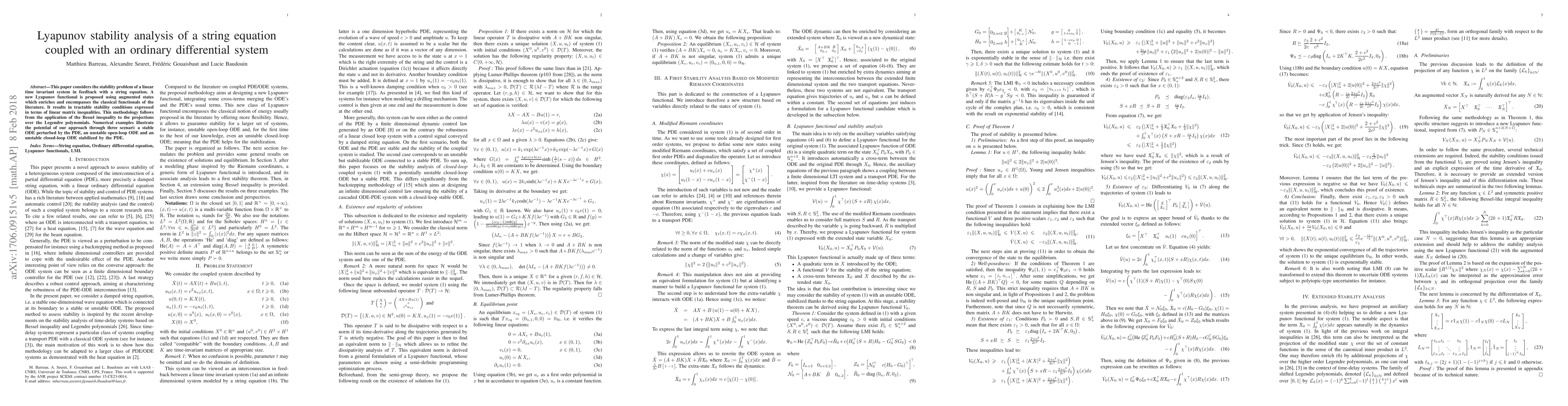 This paper proposes a new Lyapunov functional for analyzing the stability of a linear time-invariant system coupled with a string equation, resulting in tractable stability conditions via linear matrix inequalities. Numerical examples demonstrate the effectiveness of the approach in stabilizing various scenarios.