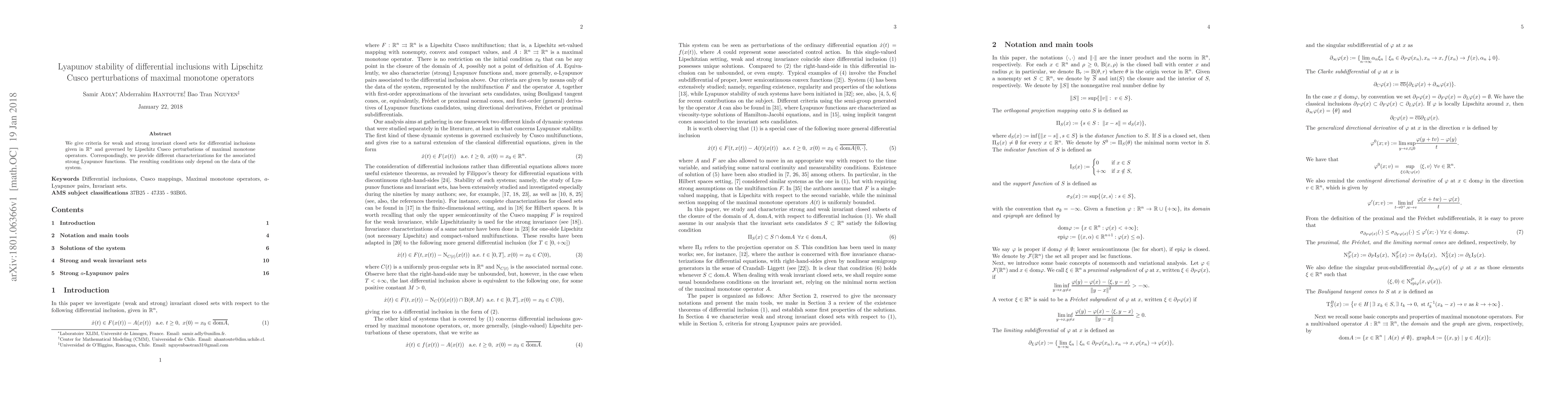 This paper establishes criteria for invariant closed sets and provides characterizations of strong Lyapunov functions for differential inclusions influenced by Lipschitz Cusco perturbations of maximal monotone operators. The conditions derived depend solely on the system's data.
