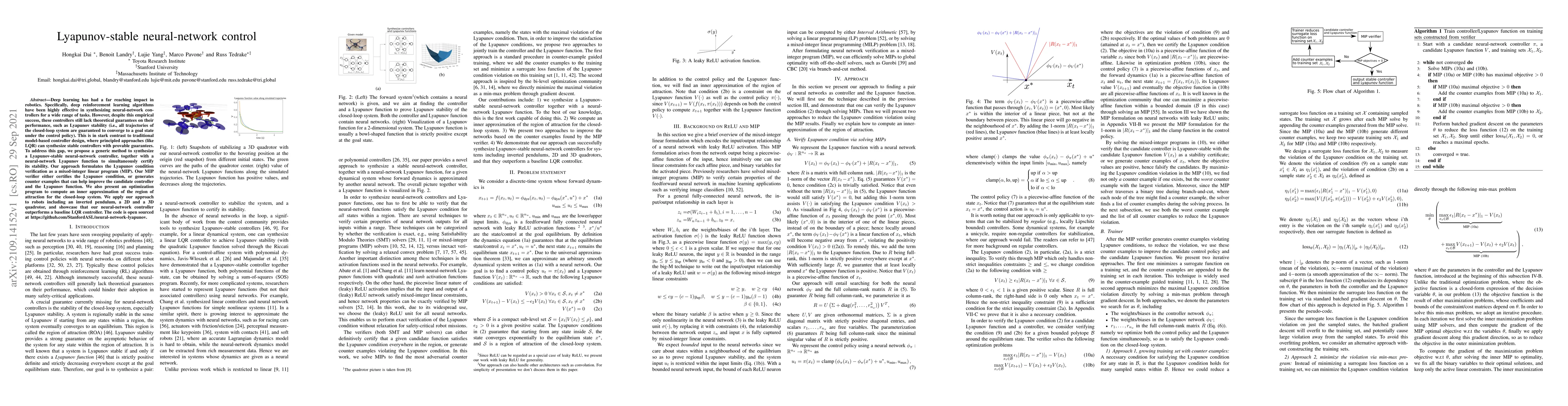This paper proposes a method for synthesizing Lyapunov-stable neural-network controllers with theoretical stability guarantees, using a mixed-integer linear program to verify the Lyapunov condition and an optimization program to compute the region of attraction. The approach is demonstrated on various robotic systems, showing improved performance over traditional LQR controllers.
