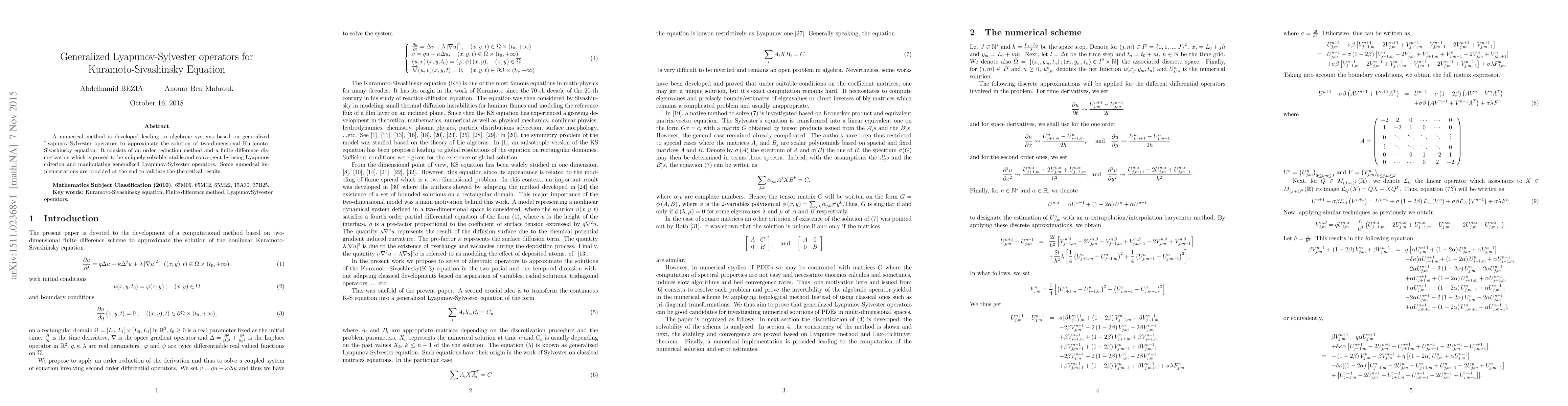 This paper develops a numerical method using generalized Lyapunov-Sylvester operators to approximate solutions for the two-dimensional Kuramoto-Sivashinsky equation, proving the method's stability, uniqueness, and convergence through theoretical analysis and numerical validation.