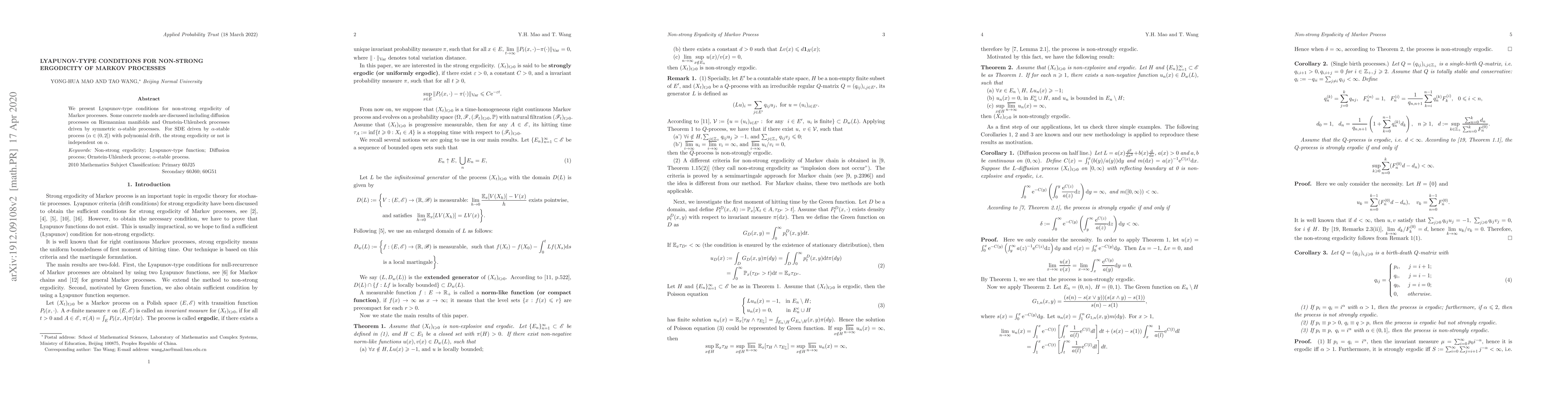 Summary: The paper introduces Lyapunov-type conditions to analyze non-strong ergodicity in Markov processes, applying these to diffusion processes and Ornstein-Uhlenbeck processes driven by stable processes, demonstrating that strong ergodicity for such SDEs is independent of the stability parameter $\alpha$.