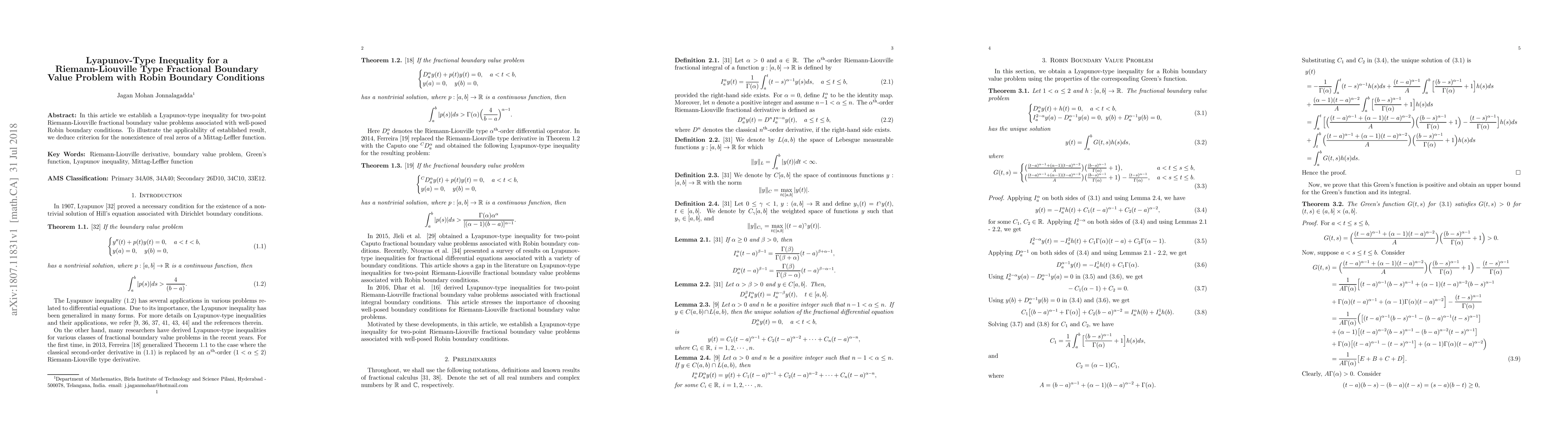 Summary: The paper establishes a Lyapunov-type inequality for Riemann-Liouville fractional boundary value problems with Robin conditions, and uses it to derive criteria for the nonexistence of real zeros of a Mittag-Leffler function.