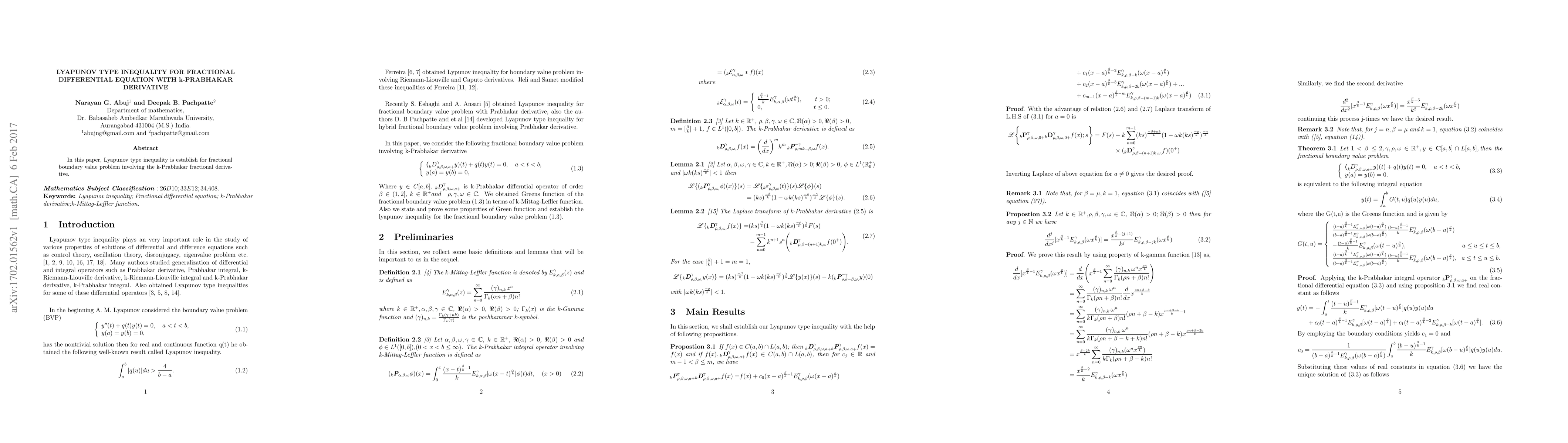 Summary: This paper establishes a Lyapunov type inequality for a fractional boundary value problem utilizing the k-Prabhakar fractional derivative. The result provides a significant theoretical framework for analyzing such differential equations.