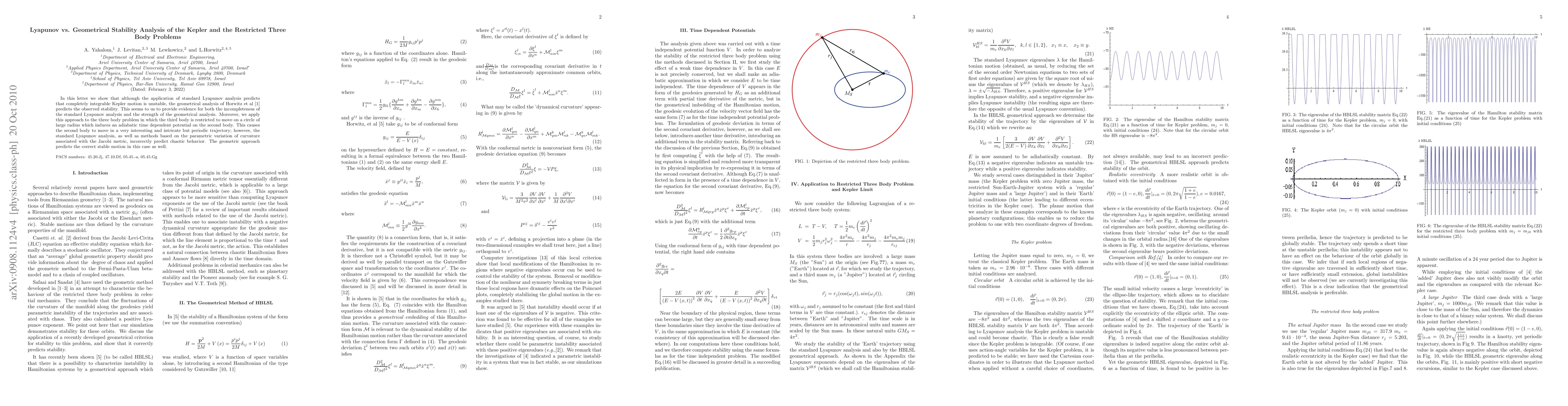 In this letter we show that although the application of standard Lyapunov analysis predicts that completely integrable Kepler motion is unstable, the geometrical analysis of Horwitz et al [1] predicts the observed stability. This seems to us to provide evidence for both the incompleteness of the standard Lyapunov analysis and the strength of the geometrical analysis. Moreover, we apply this approach to the three body problem in which the third body is restricted to move on a circle of large radius which induces an adiabatic time dependent potential on the second body. This causes the second body to move in a very interesting and intricate but periodic trajectory; however, the standard Lyapunov analysis, as well as methods based on the parametric variation of curvature associated with the Jacobi metric, incorrectly predict chaotic behavior. The geometric approach predicts the correct stable motion in this case as well.
