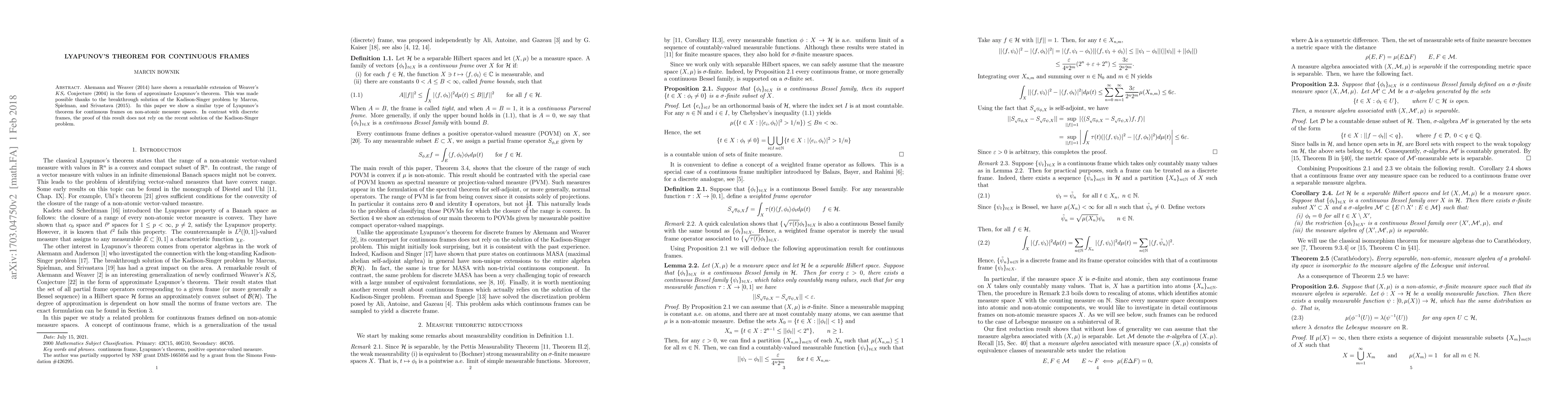 Researchers extend Lyapunov's theorem to continuous frames on non-atomic measure spaces, a breakthrough that builds upon the solution of the Kadison-Singer problem without relying on it.