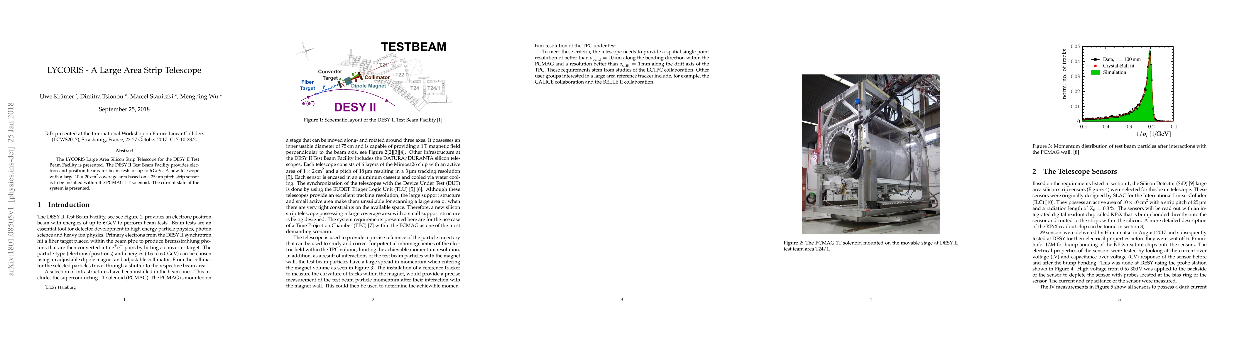 The LYCORIS telescope, designed for the DESY II Test Beam Facility, features a large 10x20 cm² silicon strip sensor with a 25 μm pitch, aimed at testing electron and positron beams up to 6 GeV. The current status and installation within the PCMAG 1 T solenoid are detailed.