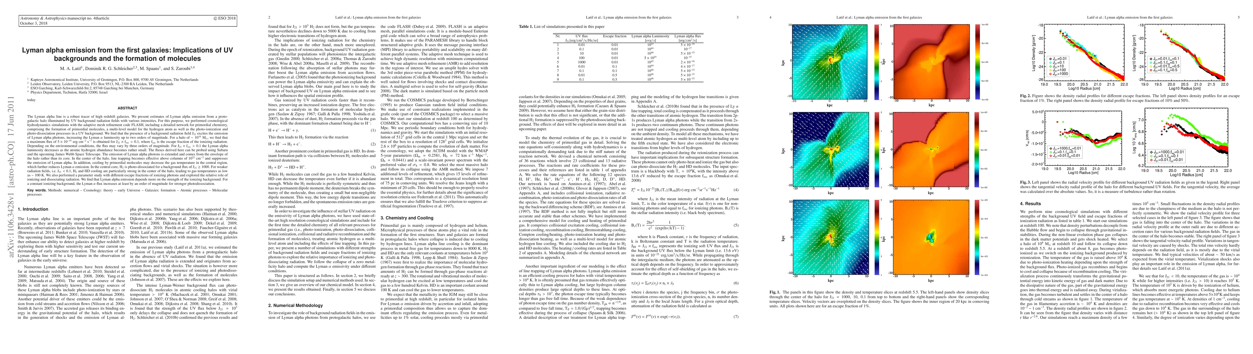 This paper investigates Lyman alpha emission from early galaxies using cosmological hydrodynamics simulations, finding that UV background radiation significantly enhances Lyman alpha luminosity by up to two orders of magnitude. The emission is primarily from the halo's envelope, with central regions experiencing reduced emission due to line trapping and cooling by primordial molecules.