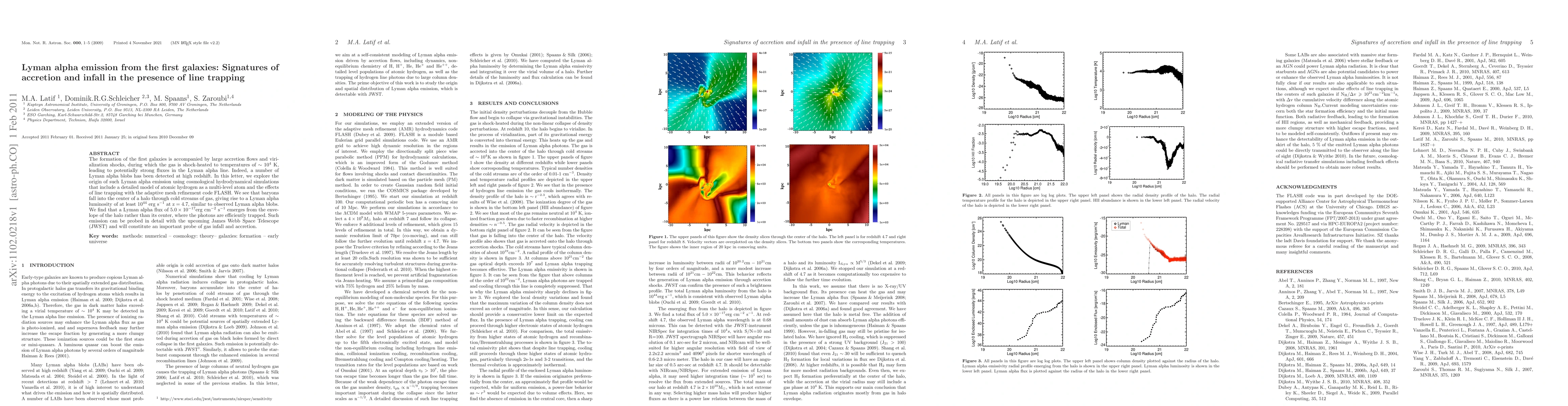 This paper investigates the Lyman alpha emission from the first galaxies, revealing that accretion flows and line trapping significantly influence the emission. Simulations show that gas infall into halos generates strong Lyman alpha fluxes, with the majority of the flux emerging from the halo's envelope rather than its center, where photons are trapped.