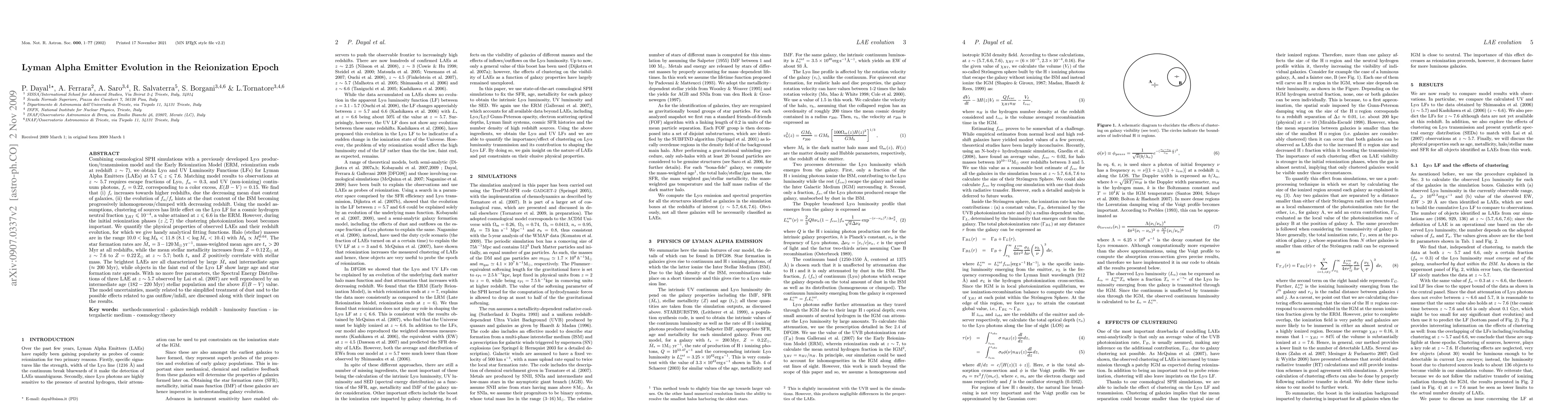 Combining cosmological SPH simulations with a previously developed Lyman Alpha production/transmission model and the Early Reionization Model (ERM, reionization ends at redshift z~7), we obtain Lyman Alpha and UV Luminosity Functions (LFs) for Lyman Alpha Emitters (LAEs) for redshifts between 5.7 and 7.6. Matching model results to observations at z~5.7 requires escape fractions of Lyman Alpha, f_alpha=0.3, and UV (non-ionizing) continuum photons, f_c=0.22, corresponding to a color excess, E(B-V)=0.15. We find that (i) f_c increases towards higher redshifts, due the decreasing mean dust content of galaxies, (ii) the evolution of f_alpha/f_c hints at the dust content of the ISM becoming progressively inhomogeneous/clumped with decreasing redshift. The clustering photoionization boost is important during the initial reionization phases but has little effect on the Lyman Alpha LF for a highly ionized IGM. Halo (stellar) masses are in the range 10.0 < \log M_h < 11.8 (8.1 < \log M_* < 10.4) with M_h \propto M_*^{0.64}. The star formation rates are between 3-120 solar masses per year, mass-weighted mean ages are greater than 20 Myr at all redshifts, while the mean stellar metallicity increases from Z=0.12 to 0.22 solar metallicity from z~7.6 to z~5.7; both age and metallicity positively correlate with stellar mass. The brightest LAEs are all characterized by large star formation rates and intermediate ages (~200 Myr), while objects in the faint end of the Lyman Alpha LF show large age and star formation rate spreads. With no more free parameters, the Spectral Energy Distributions of three LAE at z~5.7 observed by Lai et al. (2007) are well reproduced by an intermediate age (182-220 Myr) stellar population and the above E(B-V) value.
