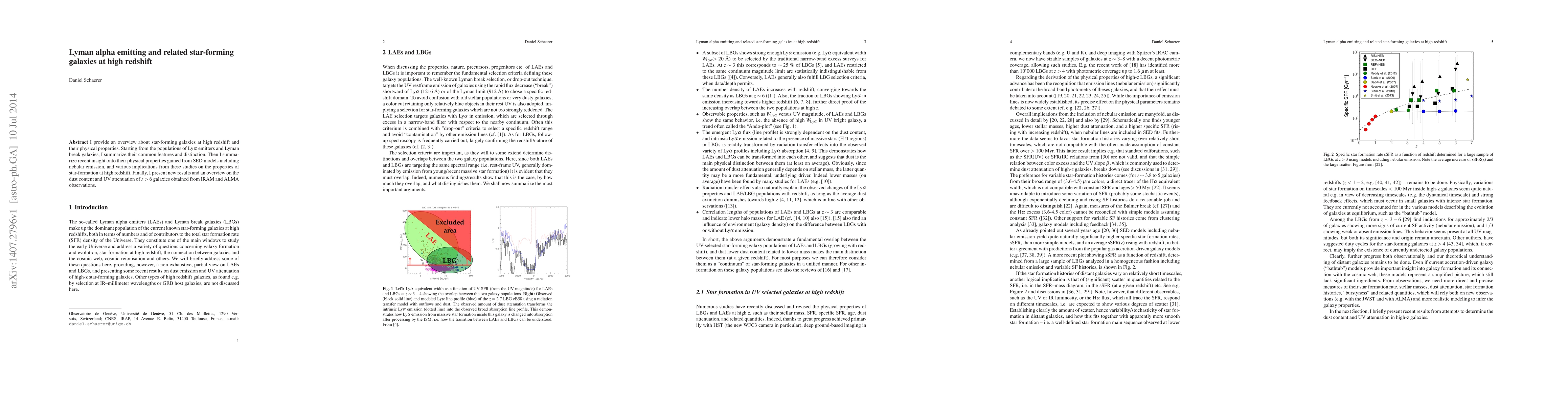 I provide an overview about star-forming galaxies at high redshift and their physical properties. Starting from the populations of Ly-$\alpha$ emitters and Lyman break galaxies, I summarize their common features and distinction. Then I summarize recent insight onto their physical properties gained from SED models including nebular emission, and various implications from these studies on the properties of star-formation at high redshift. Finally, I present new results and an overview on the dust content and UV attenuation of $z>6$ galaxies obtained from IRAM and ALMA observations.