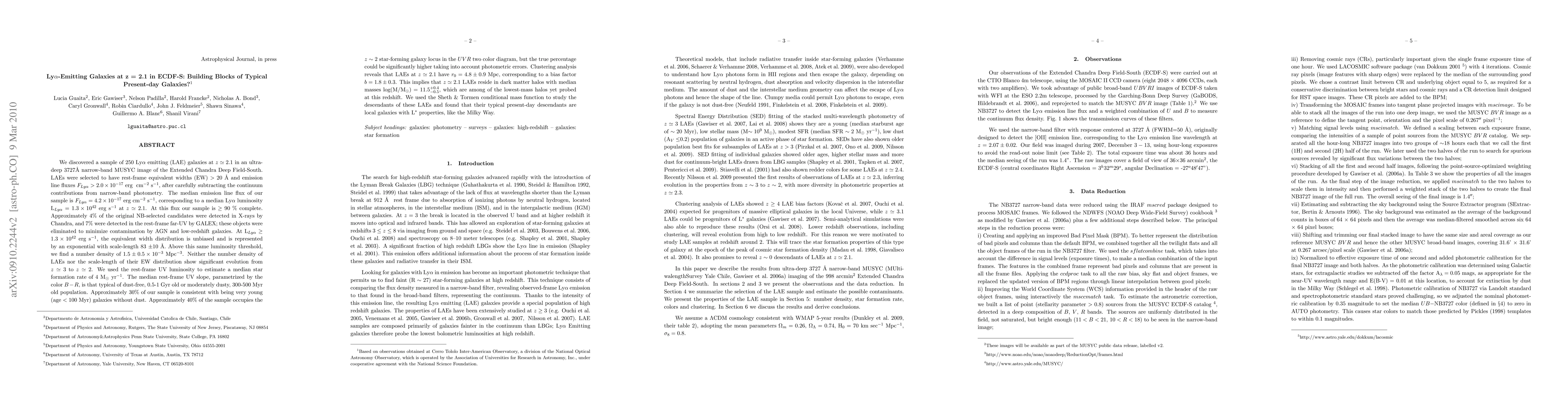 We discovered a sample of 250 Ly-Alpha emitting (LAE) galaxies at z=2.1 in an ultra-deep 3727 A narrow-band MUSYC image of the Extended Chandra Deep Field-South. LAEs were selected to have rest-frame equivalent widths (EW) > 20 A and emission line fluxes > 2.0 x 10^(-17)erg /cm^2/s, after carefully subtracting the continuum contributions from narrow band photometry. The median flux of our sample is 4.2 x 10^(-17)erg/cm^2/s, corresponding to a median Lya luminosity = 1.3 x 10^(42) erg/s at z=2.1. At this flux our sample is > 90% complete. Approximately 4% of the original NB-selected candidates were detected in X-rays by Chandra, and 7% were detected in the rest-frame far-UV by GALEX. At luminosity>1.3 x 10^42 erg/s, the equivalent width distribution is unbiased and is represented by an exponential with scale-length of 83+/-10 A. Above this same luminosity threshold, we find a number density of 1.5+/-0.5 x 10^-3 Mpc^-3. Neither the number density of LAEs nor the scale-length of their EW distribution show significant evolution from z=3 to z=2. We used the rest frame UV luminosity to estimate a median star formation rate of 4 M_(sun) /yr. The median rest frame UV slope, parametrized by B-R, is that typical of dust-free, 0.5-1 Gyr old or moderately dusty, 300-500 Myr old populations. Approximately 40% of the sample occupies the z~2 star-forming galaxy locus in the UVR two color diagram. Clustering analysis reveals that LAEs at z=2.1 have r_0=4.8+/-0.9 Mpc and a bias factor b=1.8+/-0.3. This implies that z=2.1 LAEs reside in dark matter halos with median masses Log(M/M_(sun))=11.5^(+0.4)_(-0.5), which are among of the lowest-mass halos yet probed at this redshift. We used the Sheth-Tormen conditional mass function to study the descendants of these LAEs and found that their typical present-day descendants are local galaxies with L* properties, like the Milky Way.