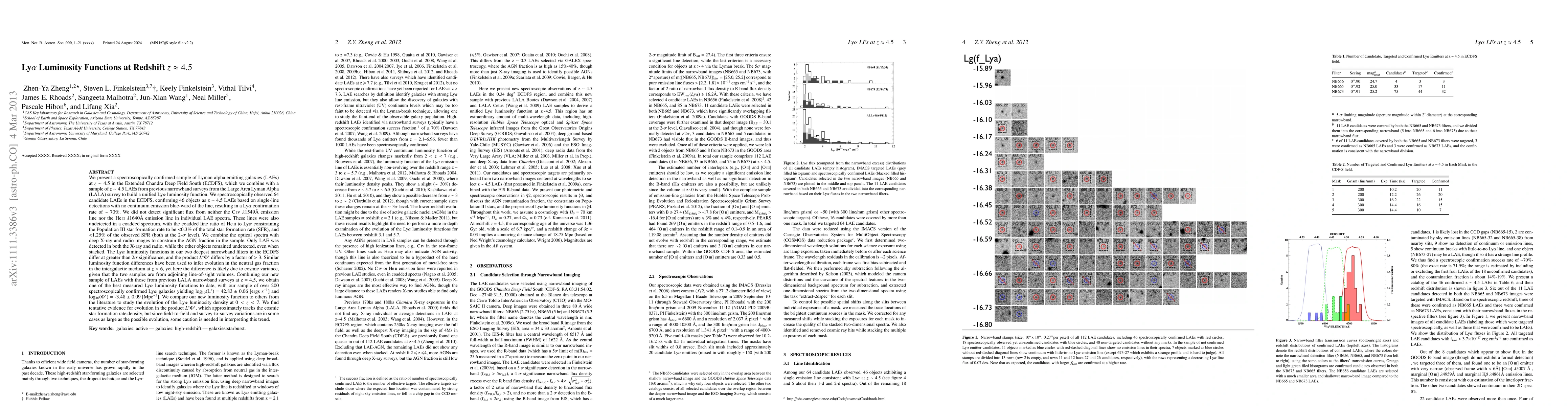 This paper presents a combined Lyman alpha luminosity function (LF) for galaxies at z ~ 4.5, derived from spectroscopically confirmed LAEs in the ECDFS and LALA survey. The study finds significant differences in LF measurements likely due to cosmic variance rather than evolution, though there is tentative evidence for a trend in the product $L^*\Phi^*$ that correlates with cosmic SFR density.