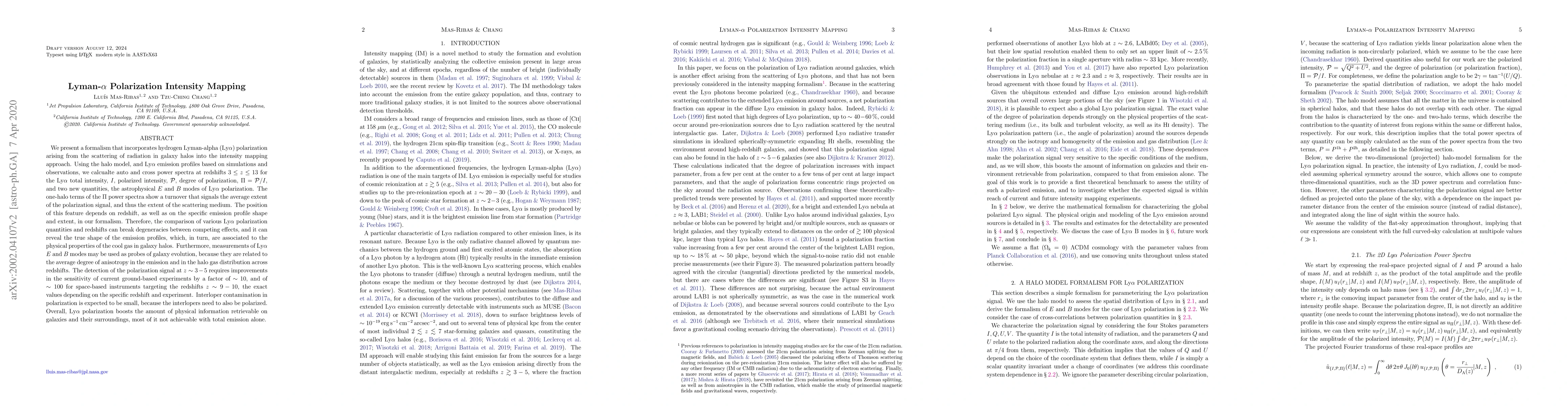 We present a formalism that incorporates hydrogen Lyman-alpha (Ly$\alpha$) polarization arising from the scattering of radiation in galaxy halos into the intensity mapping approach. Using the halo model, and emission profiles based on simulations and observations, we calculate auto and cross power spectra at redshifts $3\leq z \leq13$ for the Ly$\alpha$ total intensity, $I$, polarized intensity, $P$, degree of polarization, $\Pi=P/I$, and two new quantities, the astrophysical $E$ and $B$ modes of Ly$\alpha$ polarization. The one-halo terms of the $\Pi$ power spectra show a turnover that signals the average extent of the polarization signal, and thus the extent of the scattering medium. The position of this feature depends on redshift, and on the specific emission profile shape and extent, in our formalism. Therefore, the comparison of various Ly$\alpha$ polarization quantities and redshifts can break degeneracies between competing effects, and it can reveal the true shape of the emission profiles, and thus, the physical properties of the cool gas in halos. Furthermore, measurements of Ly$\alpha$ $E$ and $B$ modes may be used as probes of galaxy evolution, because they are related to the average degree of anisotropy in the emission and in the halo gas distribution across redshifts. The detection of the polarization signal at $z \sim 3-5$ requires improvements in the sensitivity of current ground-based experiments by a factor of $\sim 10$, and of $\sim 100$ for space-based instruments targeting the redshifts $z\sim 9-10$, the exact values depending on the specific redshift and experiment. Interloper contamination in polarization is expected to be small, because the interlopers need to also be polarized. Overall, Ly$\alpha$ polarization boosts the amount of physical information retrievable on galaxies and their surroundings, most of it not achievable with total emission alone. (abridged)