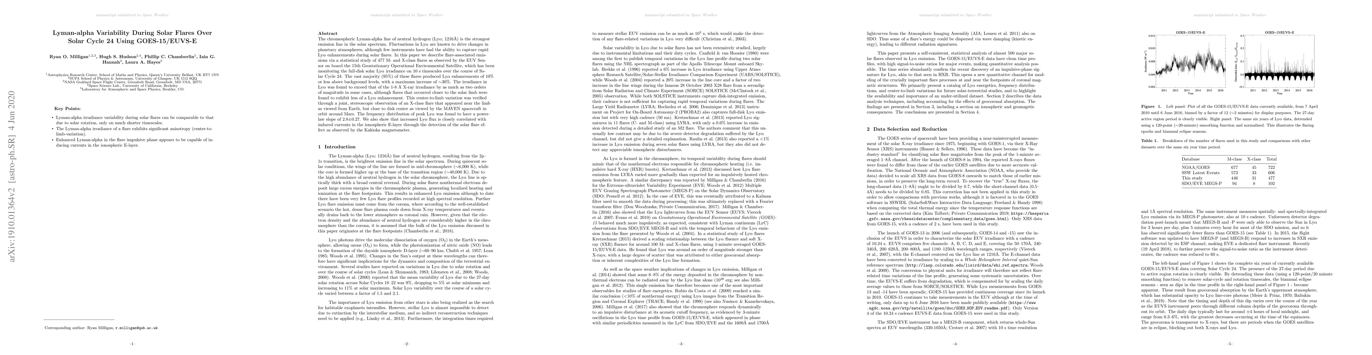 The chromospheric Lyman-alpha line of neutral hydrogen (\lya; 1216\AA) is the strongest emission line in the solar spectrum. Fluctuations in \lya\ are known to drive changes in planetary atmospheres, although few instruments have had the ability to capture rapid \lya\ enhancements during solar flares. In this paper we describe flare-associated emissions via a statistical study of 477 M- and X-class flares as observed by the EUV Sensor on board the 15th Geostationary Operational Environmental Satellite, which has been monitoring the full-disk solar \lya\ irradiance on 10~s timescales over the course of Solar Cycle 24. The vast majority (95\%) of these flares produced \lya\ enhancements of 10\% or less above background levels, with a maximum increase of $\sim$30\%. The irradiance in \lya\ was found to exceed that of the 1-8 \AA\ X-ray irradiance by as much as two orders of magnitude in some cases, although flares that occurred closer to the solar limb were found to exhibit less of a \lya\ enhancement. This center-to-limb variation was verified through a joint, stereoscopic observation of an X-class flare that appeared near the limb as viewed from Earth, but close to disk center as viewed by the MAVEN spacecraft in orbit around Mars. The frequency distribution of peak \lya\ was found to have a power-law slope of $2.8\pm0.27$. We also show that increased \lya\ flux is closely correlated with induced currents in the ionospheric E-layer through the detection of the solar flare effect as observed by the Kakioka magnetometer.