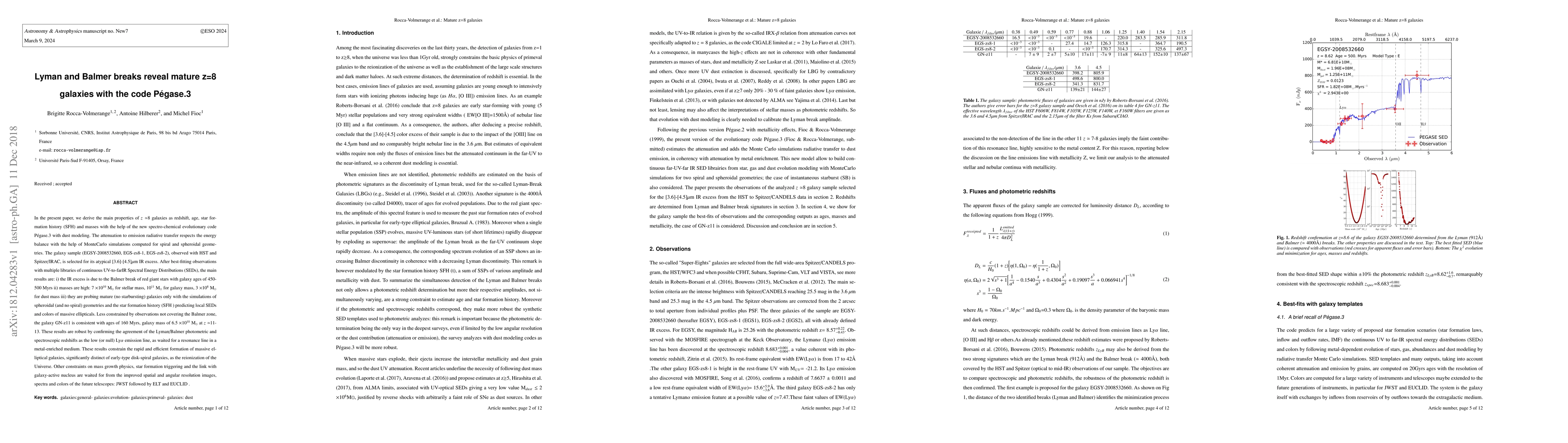 The z=8 galaxy sample (EGSY-2008532660, EGS-zs8-1, EGS-zs8-2), observed with HST and Spitzer/IRAC, was selected for its atypical [3.6]-[4.5]mum IR excess. The best-fitting of observations is processed with multiple libraries of continuous UV-to-farIR spectral energy distributions (SEDs) with the help of the code Pegase.3 with dust (Fioc and Rocca-Volmerange, 2018, submitted to AA). The main results are: i) the IR excess is due to the Balmer break of red giant stars with galaxy ages of 450-500 Myrs ii) masses are high: 7 10^10 Msun for stellar mass, 10^11 Msun for galaxy mass, 3 10^8 Msun for dust mass iii) they are probing mature (no starbursting) galaxies only with the simulations of spheroidal (and no spiral) geometries and the star formation history (SFH ) of massive ellipticals. Less constrained by observations not covering the Balmer zone, the galaxy GN-z11 is consistent. These results constrain the rapid and efficient formation of massive elliptical galaxies, significantly distinct of early-type disk-spiral galaxies, and the reionization of the Universe