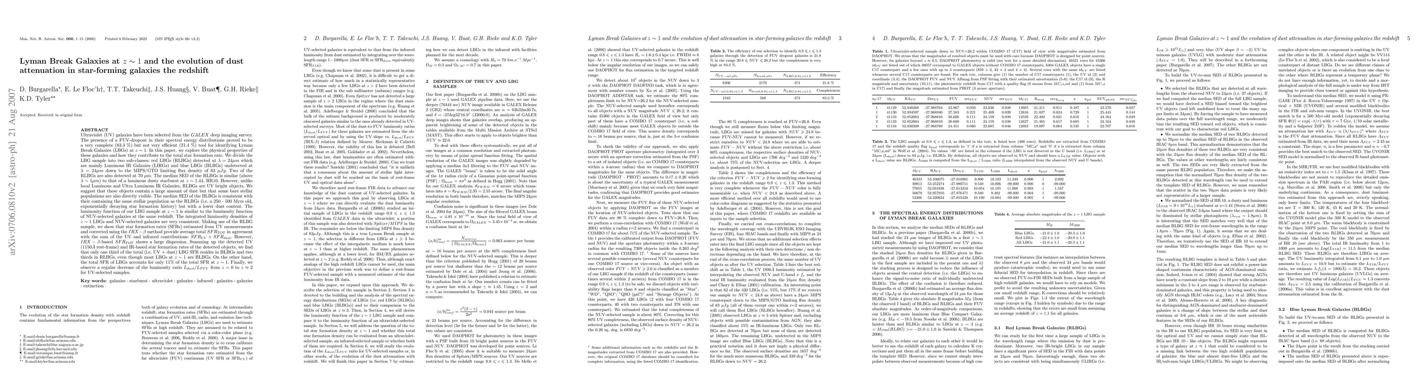 Ultraviolet (UV) galaxies have been selected from GALEX. The presence of a FUV-dropout in their spectral energy distributions proved to be a very complete (83.3%) but not very efficient (21.4%) tool for identifying Lyman Break Galaxies (LBGs) at z~1. We divide the LBG sample into two sub-classes: red LBGs (RLBGs) detected at 24 micron which are mainly Luminous IR Galaxies (LIRGs) and blue LBGs (BLBGs) undetected at 24 microns down to 83 microJy. Two of the RLBGs are also detected at 70 micron. The median SED of the RLBGs is similar (above lambda~1 micron) to the dusty starburst HR10. However, unlike local (U)LIRGs, RLBGs are UV bright objects. We suggest that these objects contain a large amount of dust but that some bare stellar populations are also directly visible. The median SED of the BLBGs is consistent with their containing the same stellar population as the RLBGs but with a lower dust content. The luminosity function of our LBG sample at z~1 is similar to the luminosity function of NUV-selected galaxies at the same redshift. The integrated luminosity densities of z~1 LBGs and NUV-selected galaxies are very consistent. We show that star formation rates (SFRs) estimated from UV measurements and corrected using the IRX-beta method provide average total SFR_TOT in agreement with SFR_UV + SFR_dust. However, IRX-beta-based SFR_TOT shows a large dispersion. Summing up the detected UV (1150A rest-frame) and IR-based star formation rates of the detected objects, we find that only one third of the total (i.e. UV + dust) LBG SFR resides in BLBGs and two thirds in RLBGs, even though most LBGs at z~1 are BLBGs. On the other hand, the total SFR of LBGs accounts for only 11% of the total SFR at z~1. Finally, we observe a regular decrease of L_TIR / L_FUV from z=0 to z~2 for UV-selected samples.