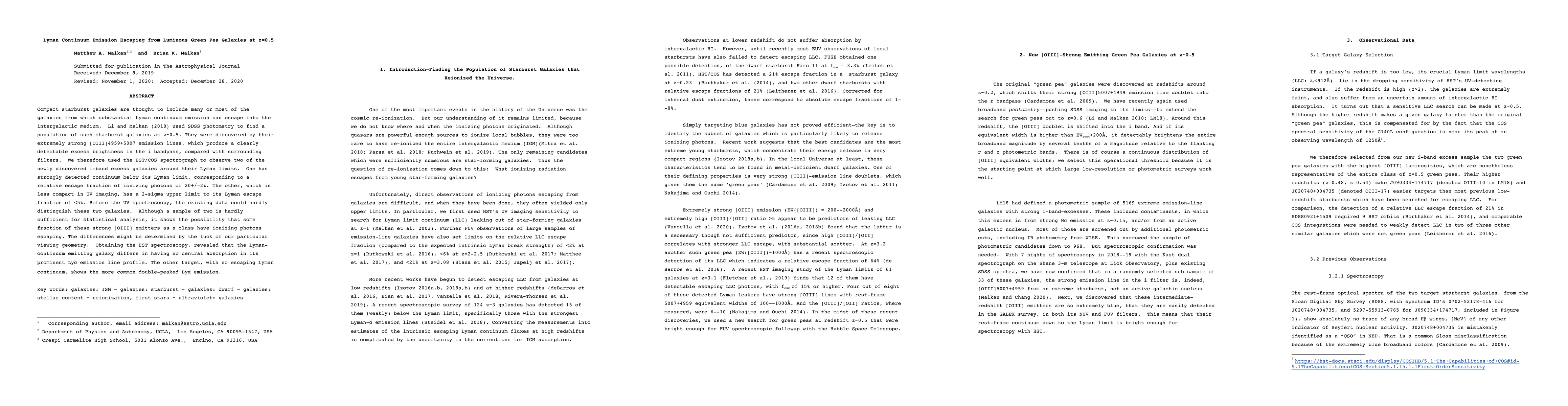 Compact starburst galaxies are thought to include many or most of the galaxies from which substantial Lyman continuum emission can escape into the intergalactic medium. Li and Malkan (2018) used SDSS photometry to find a population of such starburst galaxies at z~0.5. They were discovered by their extremely strong [OIII]4959+5007 emission lines, which produce a clearly detectable excess brightness in the i bandpass, compared with surrounding filters. We therefore used the HST/COS spectrograph to observe two of the newly discovered i-band excess galaxies around their Lyman limits. One has strongly detected continuum below its Lyman limit, corresponding to a relative escape fraction of ionizing photons of 20+/-2%. The other, which is less compact in UV imaging, has a 2-sigma upper limit to its Lyman escape fraction of <5%. Before the UV spectroscopy, the existing data could not distinguish these two galaxies. Although a sample of two is hardly sufficient for statistical analysis, it shows the possibility that some fraction of these strong [OIII] emitters as a class have ionizing photons escaping. The differences might be determined by the luck of our particular viewing geometry. Obtaining the HST spectroscopy, revealed that the Lyman-continuum emitting galaxy differs in having no central absorption in its prominent Ly{\alpha} emission line profile. The other target, with no escaping Lyman continuum, shows the more common double-peaked Ly{\alpha} emission.