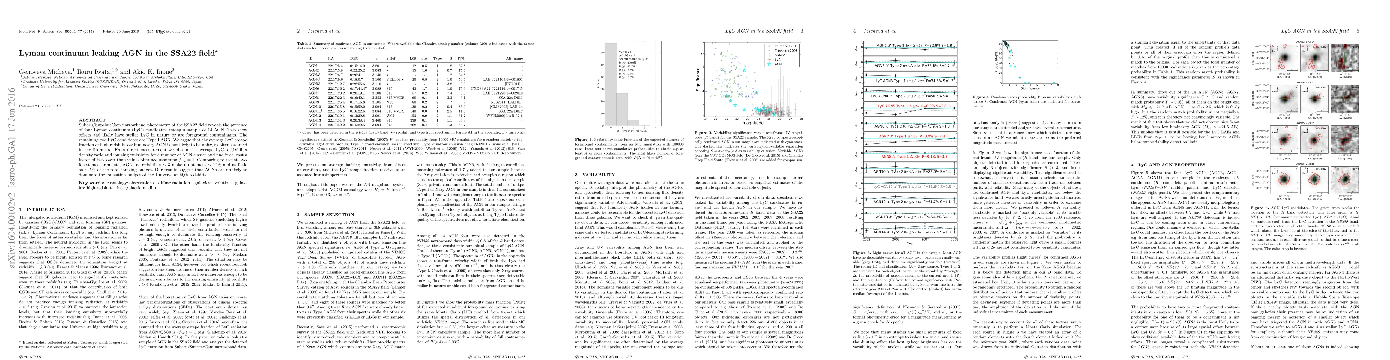 Subaru/SuprimeCam narrowband photometry of the SSA22 field reveals the presence of four Lyman continuum (LyC) candidates among a sample of 14 AGN. Two show offsets and likely have stellar LyC in nature or are foreground contaminants. The remaining two LyC candidates are Type I AGN. We argue that the average LyC escape fraction of high redshift low luminosity AGN is not likely to be unity, as often assumed in the literature. From direct measurement we obtain the average LyC-to-UV flux density ratio and ionizing emissivity for a number of AGN classes and find it at least a factor of two lower than values obtained assuming f_esc = 1. Comparing to recent Ly{\alpha} forest measurements, AGNs at redshift z~3 make up at most ~12% and as little as ~5% of the total ionizing budget. Our results suggest that AGNs are unlikely to dominate the ionization budget of the Universe at high redshifts.