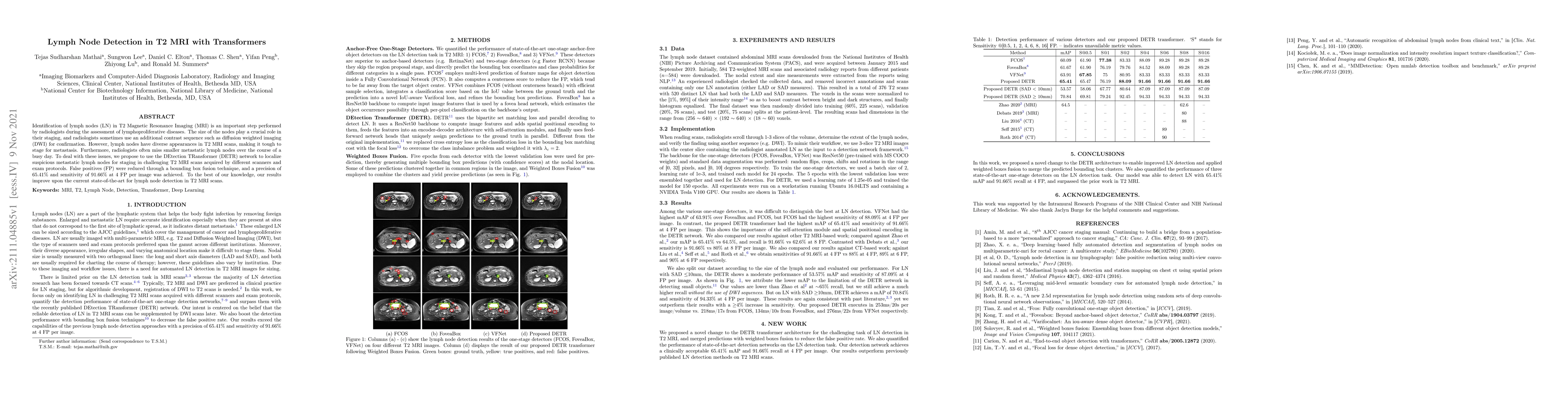 Identification of lymph nodes (LN) in T2 Magnetic Resonance Imaging (MRI) is an important step performed by radiologists during the assessment of lymphoproliferative diseases. The size of the nodes play a crucial role in their staging, and radiologists sometimes use an additional contrast sequence such as diffusion weighted imaging (DWI) for confirmation. However, lymph nodes have diverse appearances in T2 MRI scans, making it tough to stage for metastasis. Furthermore, radiologists often miss smaller metastatic lymph nodes over the course of a busy day. To deal with these issues, we propose to use the DEtection TRansformer (DETR) network to localize suspicious metastatic lymph nodes for staging in challenging T2 MRI scans acquired by different scanners and exam protocols. False positives (FP) were reduced through a bounding box fusion technique, and a precision of 65.41\% and sensitivity of 91.66\% at 4 FP per image was achieved. To the best of our knowledge, our results improve upon the current state-of-the-art for lymph node detection in T2 MRI scans.