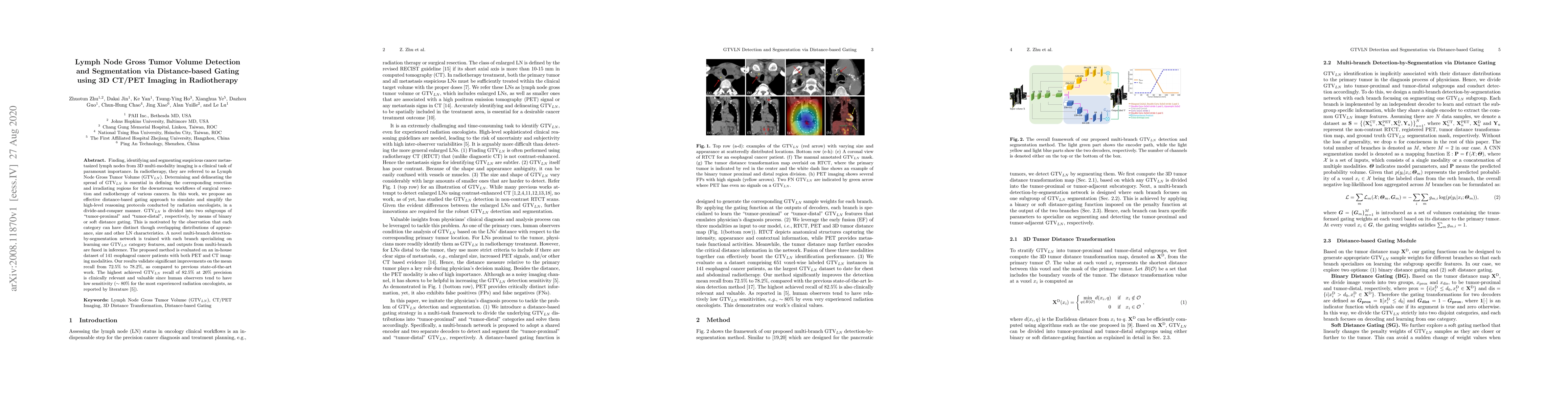 This paper proposes a distance-based gating method for detecting and segmenting Lymph Node Gross Tumor Volumes (GTVLN) from 3D CT/PET imaging, using a multi-branch detection-by-segmentation network. The method divides GTVLN into proximal and distal subgroups, improving recall from 72.5% to 78.2% compared to previous methods, achieving a clinically relevant 82.5% recall at 20% precision.