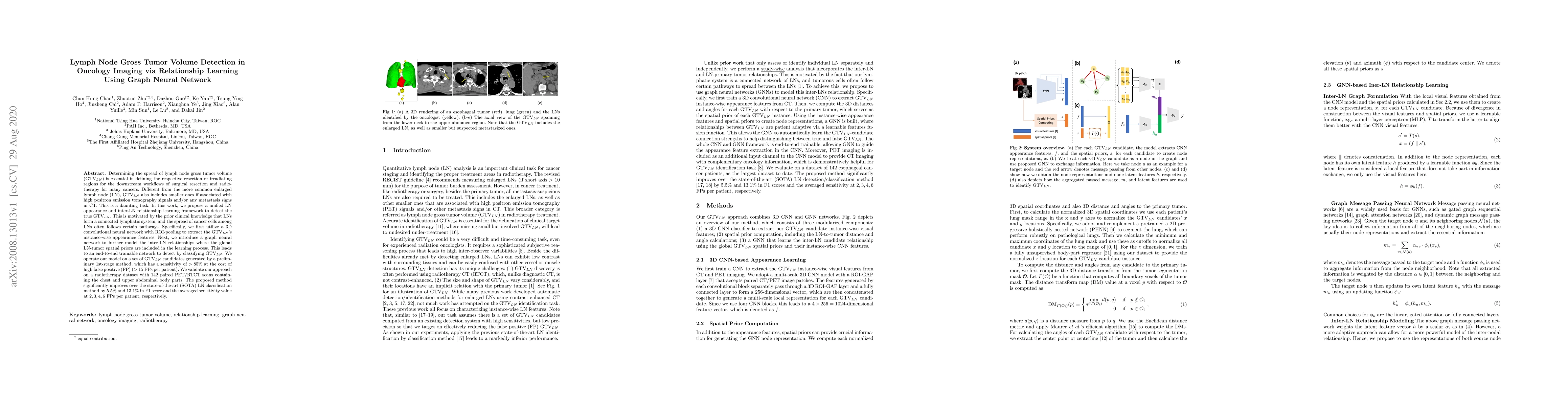 This paper proposes a graph neural network framework to detect Gross Tumor Volume in lymph nodes (GTV$_{LN}$) by learning both appearance and inter-LN relationships. The method significantly improves the detection accuracy over the state-of-the-art, achieving a $5.5\%$ boost in F1 score and higher sensitivity.