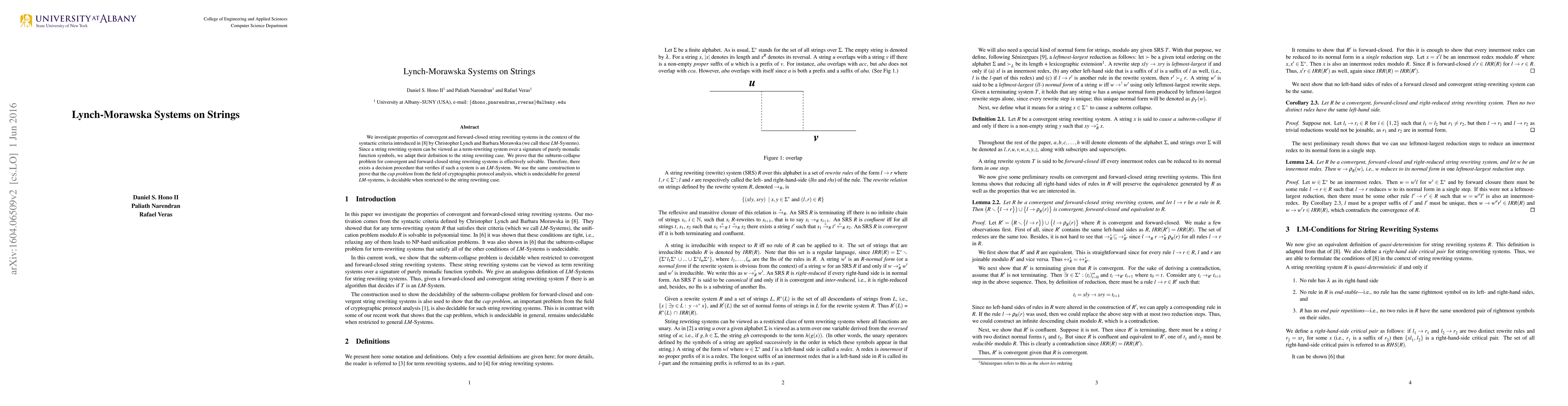 We investigate properties of convergent and forward-closed string rewriting systems in the context of the syntactic criteria introduced in \cite{LynchMorawska} by Christopher Lynch and Barbara Morawska (we call these $LM$-Systems). Since a string rewriting system can be viewed as a term-rewriting system over a signature of purely monadic function symbols, we adapt their definition to the string rewriting case. We prove that the subterm-collapse problem for convergent and forward-closed string rewriting systems is effectively solvable. Therefore, there exists a decision procedure that verifies if such a system is an $LM$-System. We use the same construction to prove that the \emph{cap problem} from the field of cryptographic protocol analysis, which is undecidable for general $LM$-systems, is decidable when restricted to the string rewriting case.