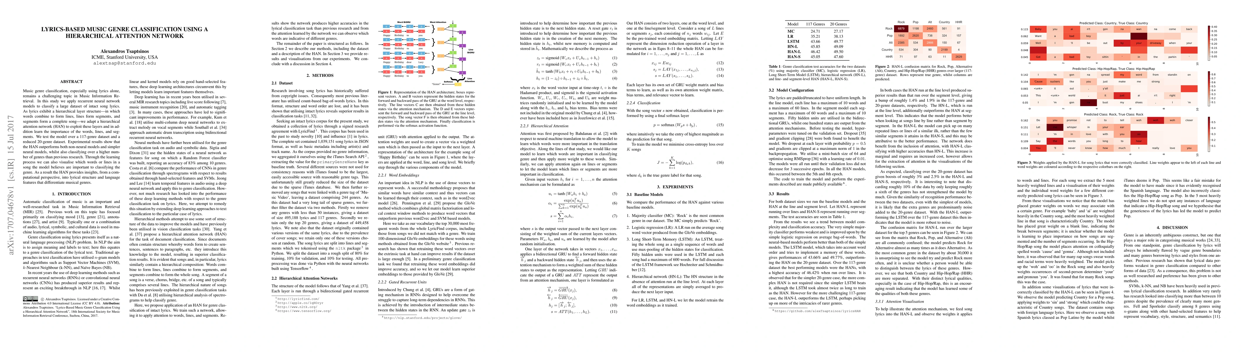 This study uses a hierarchical attention network (HAN) to classify music genres based on lyrics, leveraging the hierarchical structure of words, lines, and segments. The HAN outperforms other models and identifies important lyrical features, providing insights into genre differentiation.
