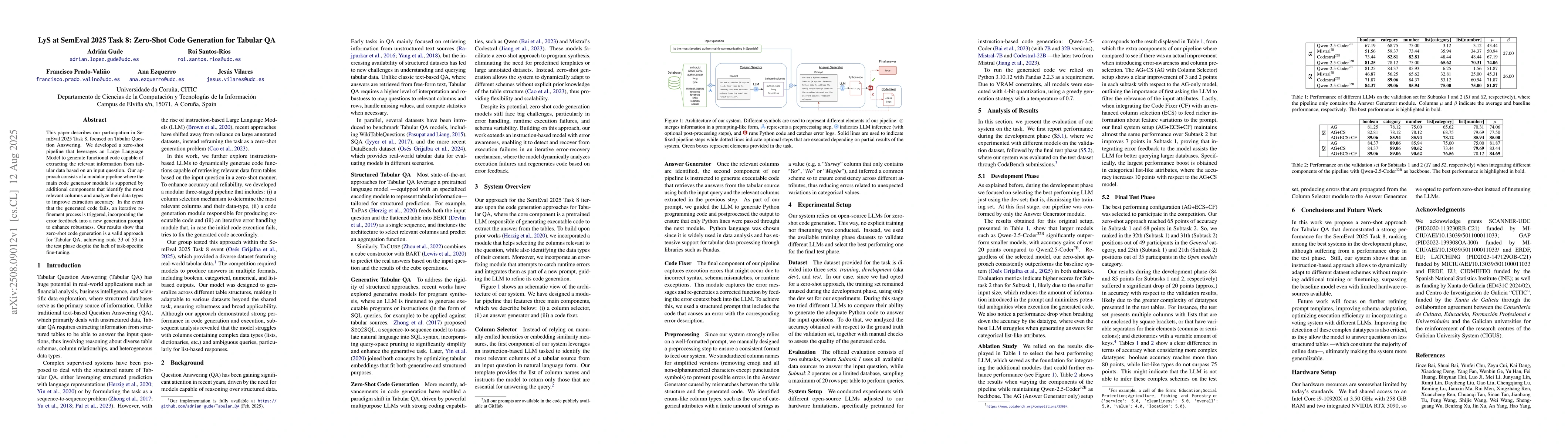 This paper describes our participation in SemEval 2025 Task 8, focused on Tabular Question Answering. We developed a zero-shot pipeline that leverages an Large Language Model to generate functional code capable of extracting the relevant information from tabular data based on an input question. Our approach consists of a modular pipeline where the main code generator module is supported by additional components that identify the most relevant columns and analyze their data types to improve extraction accuracy. In the event that the generated code fails, an iterative refinement process is triggered, incorporating the error feedback into a new generation prompt to enhance robustness. Our results show that zero-shot code generation is a valid approach for Tabular QA, achieving rank 33 of 53 in the test phase despite the lack of task-specific fine-tuning.