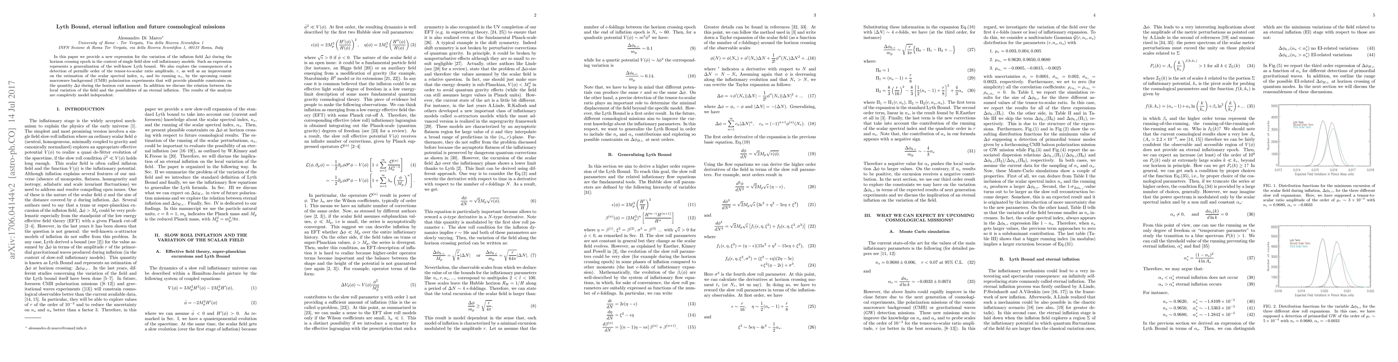 This paper generalizes the Lyth bound for the inflaton field variation during horizon crossing in single field slow roll inflation models. It also examines the implications of future CMB polarization experiments detecting permille order tensor-to-scalar ratios and improved scalar spectral index estimates, providing model-independent constraints on inflationary dynamics and discussing eternal inflation possibilities.
