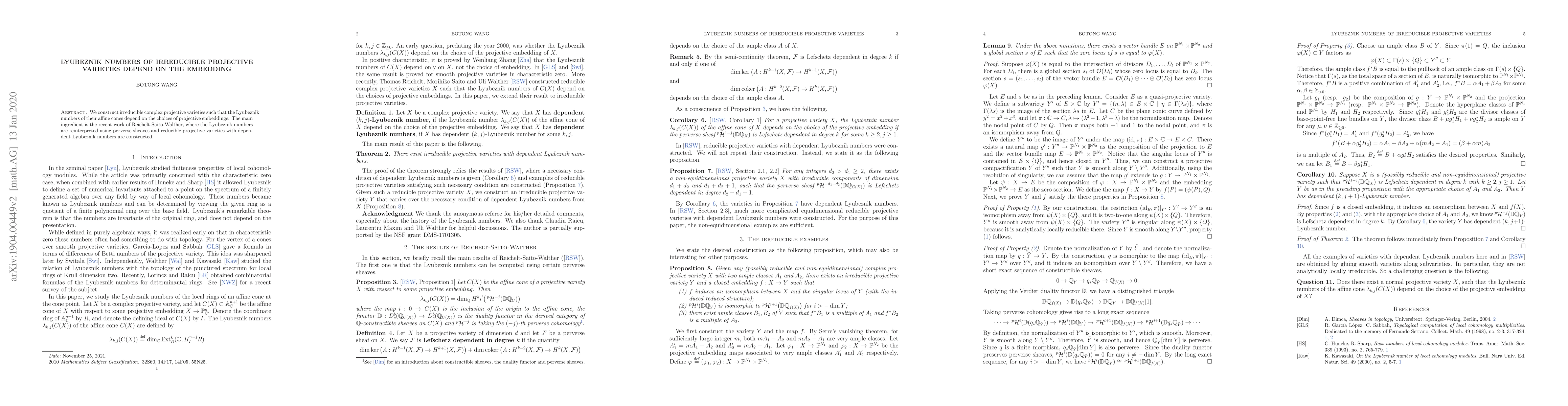 We construct irreducible complex projective varieties such that the Lyubeznik numbers of their affine cones depend on the choices of projective embeddings. The main ingredient is the recent work of Reichelt-Saito-Walther, where the Lyubeznik numbers are reinterpreted using perverse sheaves and reducible projective varieties with dependent Lyubeznik numbers are constructed.