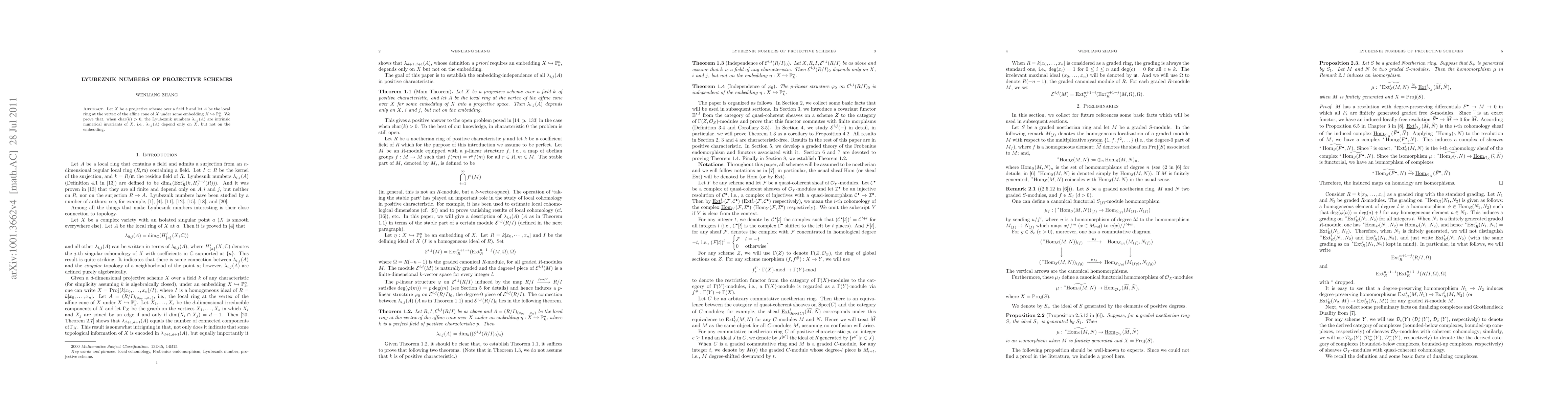 Summary: This paper proves that Lyubeznik numbers of the local ring at the vertex of the affine cone of a projective scheme $X$ over a field $k$ with positive characteristic are intrinsic invariants of $X$, independent of the chosen embedding.