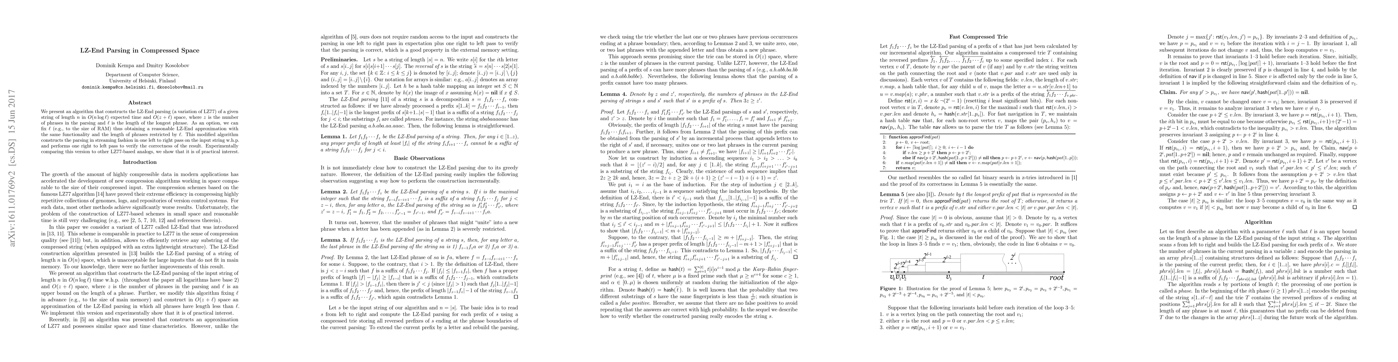 We present an algorithm that constructs the LZ-End parsing (a variation of LZ77) of a given string of length $n$ in $O(n\log\ell)$ expected time and $O(z + \ell)$ space, where $z$ is the number of phrases in the parsing and $\ell$ is the length of the longest phrase. As an option, we can fix $\ell$ (e.g., to the size of RAM) thus obtaining a reasonable LZ-End approximation with the same functionality and the length of phrases restricted by $\ell$. This modified algorithm constructs the parsing in streaming fashion in one left to right pass on the input string w.h.p. and performs one right to left pass to verify the correctness of the result. Experimentally comparing this version to other LZ77-based analogs, we show that it is of practical interest.