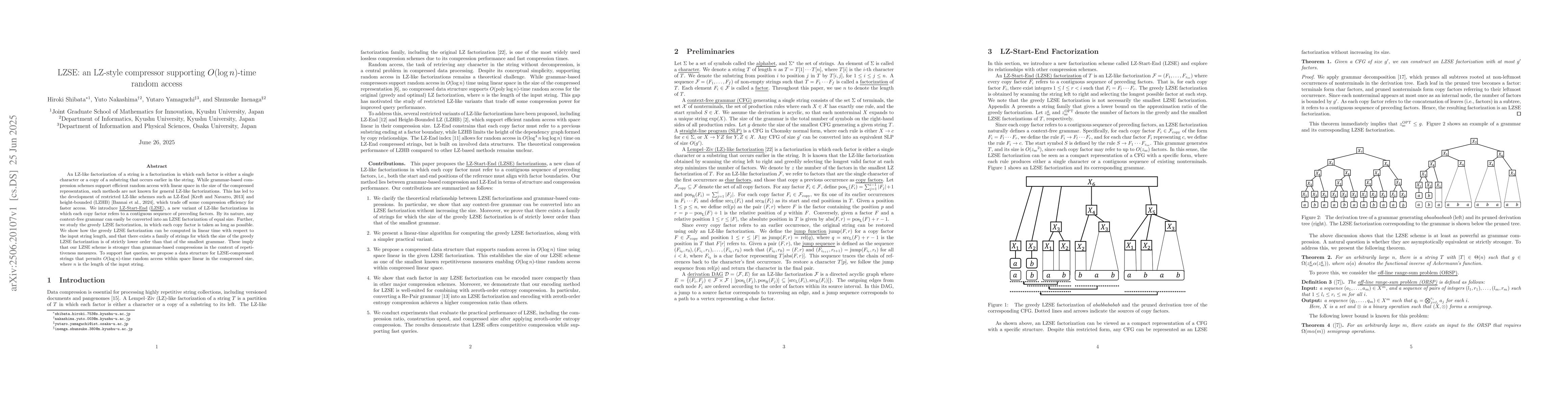 The paper introduces LZ-Start-End (LZSE), a new LZ-like compression method that supports $O(log n)$-time random access with linear space complexity. LZSE factorizes strings into contiguous copies, enabling efficient conversion from context-free grammars. The greedy LZSE factorization can be computed in linear time, offering improved compression efficiency compared to grammar-based methods for certain repetitive strings.