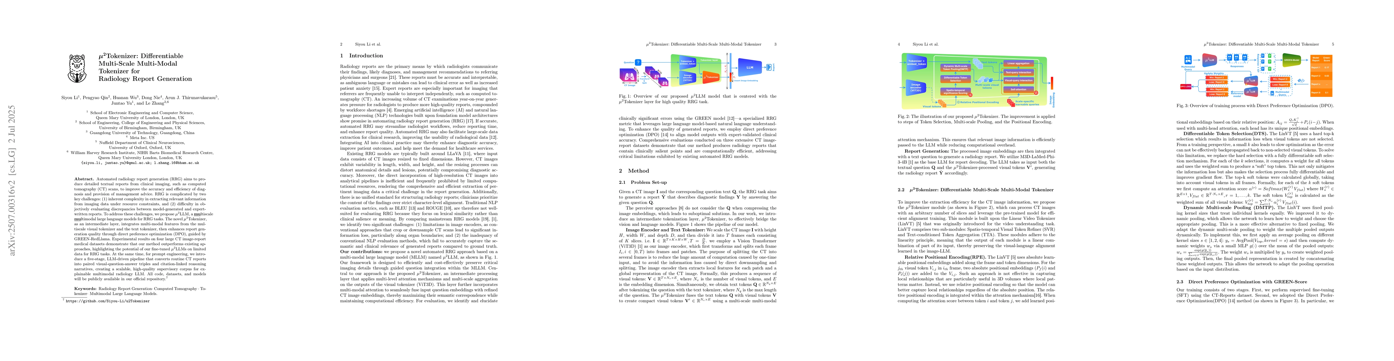 Automated radiology report generation (RRG) aims to produce detailed textual reports from clinical imaging, such as computed tomography (CT) scans, to improve the accuracy and efficiency of diagnosis and provision of management advice. RRG is complicated by two key challenges: (1) inherent complexity in extracting relevant information from imaging data under resource constraints, and (2) difficulty in objectively evaluating discrepancies between model-generated and expert-written reports. To address these challenges, we propose $\mu^2$LLM, a $\underline{\textbf{mu}}$ltiscale $\underline{\textbf{mu}}$ltimodal large language models for RRG tasks. The novel ${\mu}^2$Tokenizer, as an intermediate layer, integrates multi-modal features from the multiscale visual tokenizer and the text tokenizer, then enhances report generation quality through direct preference optimization (DPO), guided by GREEN-RedLlama. Experimental results on four large CT image-report medical datasets demonstrate that our method outperforms existing approaches, highlighting the potential of our fine-tuned $\mu^2$LLMs on limited data for RRG tasks. At the same time, for prompt engineering, we introduce a five-stage, LLM-driven pipeline that converts routine CT reports into paired visual-question-answer triples and citation-linked reasoning narratives, creating a scalable, high-quality supervisory corpus for explainable multimodal radiology LLM. All code, datasets, and models will be publicly available in our official repository. https://github.com/Siyou-Li/u2Tokenizer