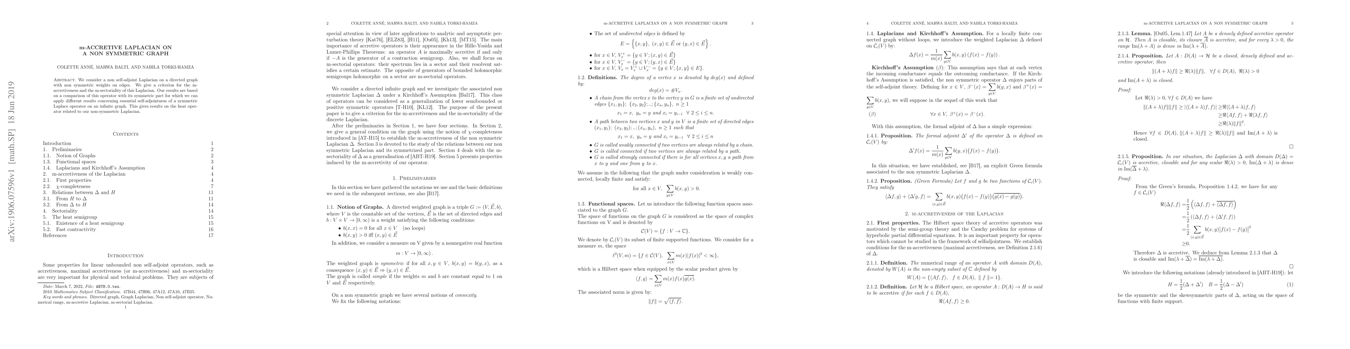 This paper explores the m-accretive Laplacian on a directed graph with non-symmetric weights, providing criteria for its m-accretiveness and m-sectoriality. It leverages comparisons with the symmetric part of the operator to derive results on the associated heat operator.