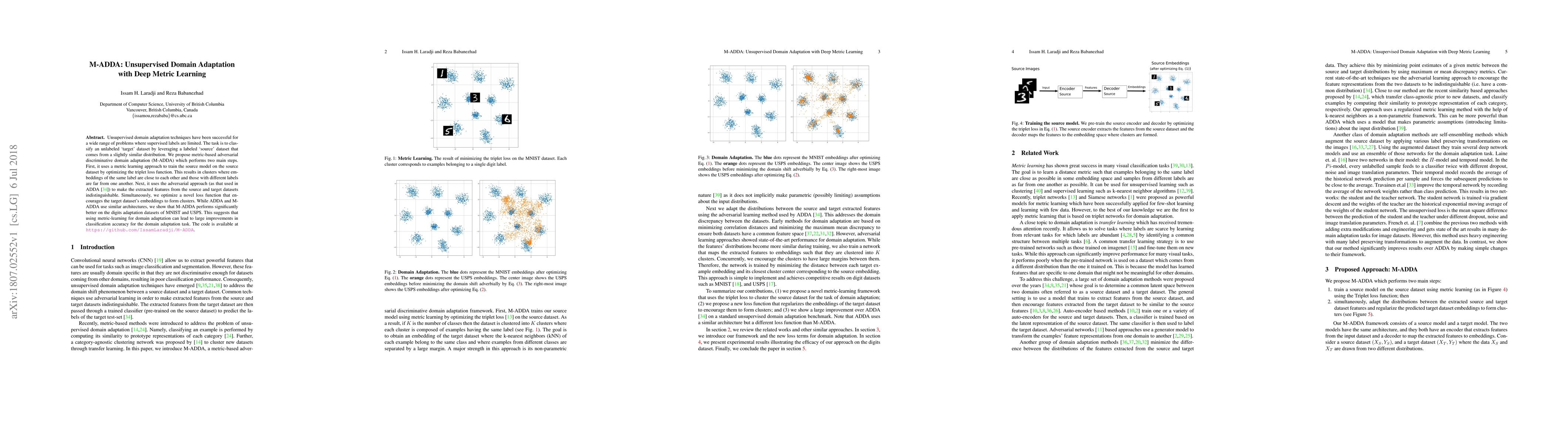 This paper proposes M-ADDA, a domain adaptation method that uses metric learning to improve classification accuracy on target datasets with limited labeled data from similar distributions.