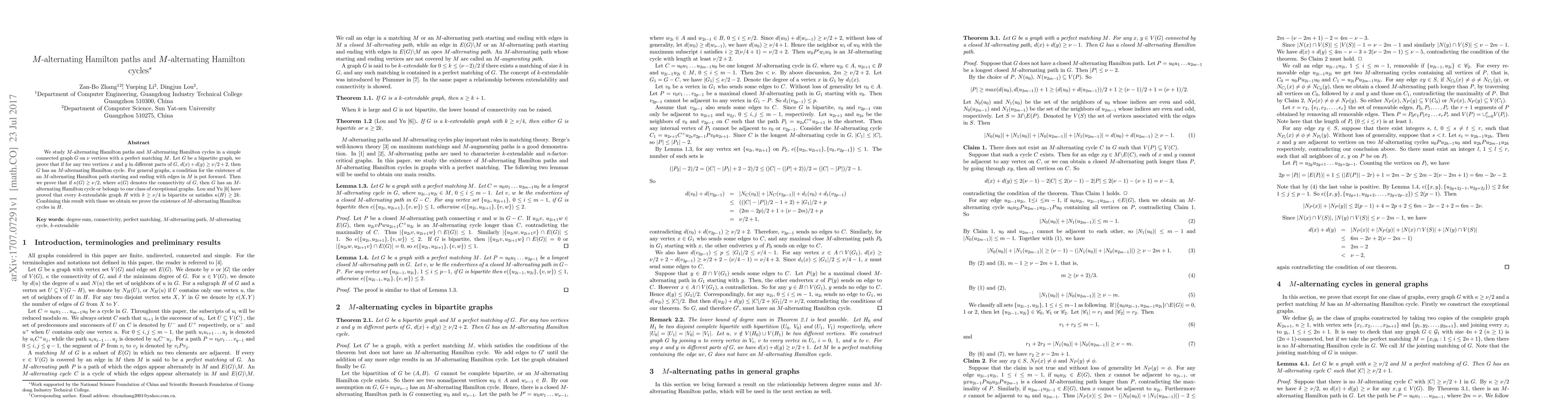 This paper investigates $M$-alternating Hamilton paths and cycles in graphs with perfect matchings, proving the existence of such cycles in bipartite graphs under certain degree conditions and in general graphs if they meet connectivity criteria. It also establishes conditions for $M$-alternating Hamilton paths and combines these results with previous findings to ensure the existence of $M$-alternating Hamilton cycles in $k$-extendable graphs.