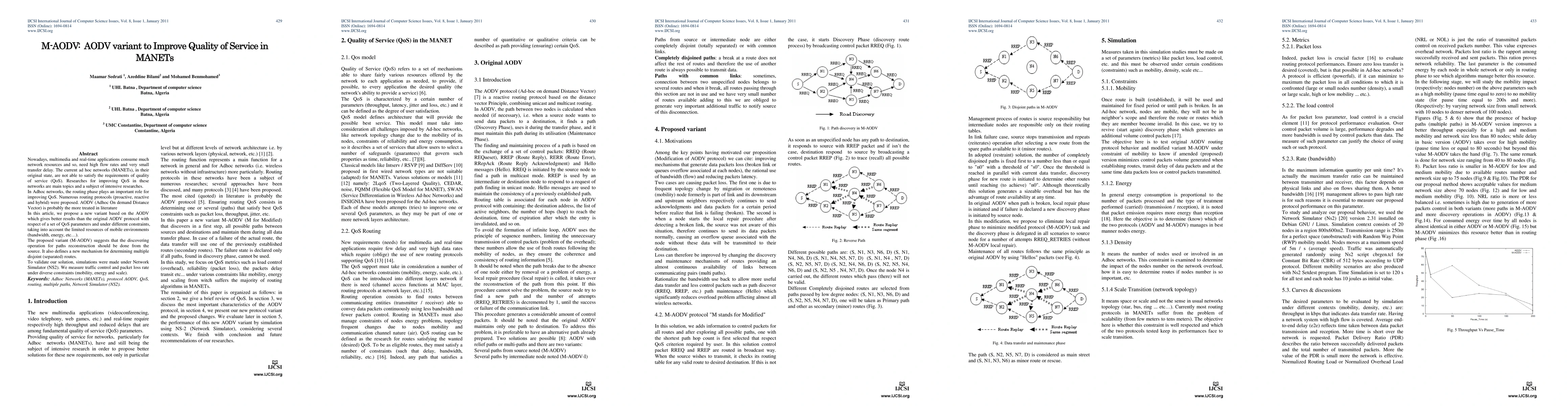 The paper proposes M-AODV, a variant of the AODV protocol designed to enhance quality of service (QoS) in mobile ad hoc networks (MANETs). M-AODV aims to better manage limited resources and improve traffic control and packet loss rates through a new path discovery and multiple disjoint route mechanism, validated via simulations in NS2.